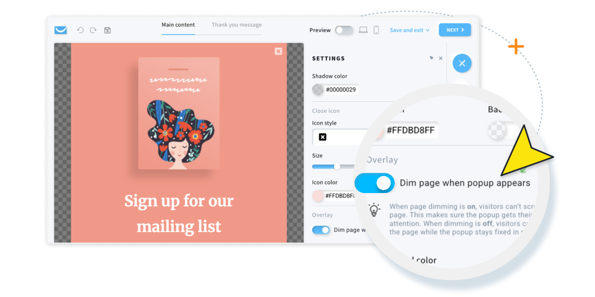 Choose how your popups behave: dim the background and block scrolling for full focus, or let visitors keep browsing while the popup stays visible.