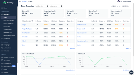 - High inboxing rates: To help you land inboxes, Mailtrap provides many deliverability features such as dedicated IPs, throttling, and dedicated sending streams that separate transactional and bulk email infrastructures.