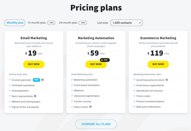 Your choice will depend on the nature of your business. If you want to run simple email marketing or drip campaigns, your best bet is the Starter plan. If you want more advanced automation scenarios, webinars, or ecommerce-specific features (e.g., abandoned cart recovery), you should look at the Marketer plan. Last but not least if you happen to be a content creator or online tutor, the Creator plan covers all the features you need.
