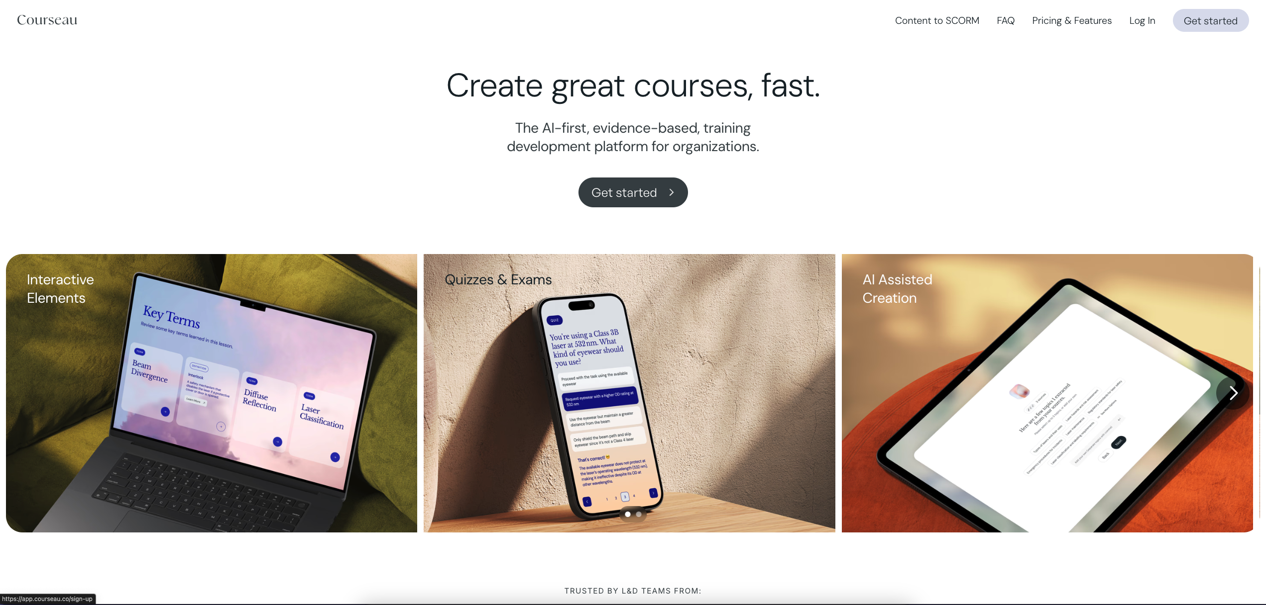 Courseau is an AI-first authoring platform that turns existing content (docs, slides, audio/video, web links) into interactive training in minutes. You can share courses via direct link or embed, or export for LMS delivery (SCORM) and editable PPTX/PDF—features that are plan-dependent.