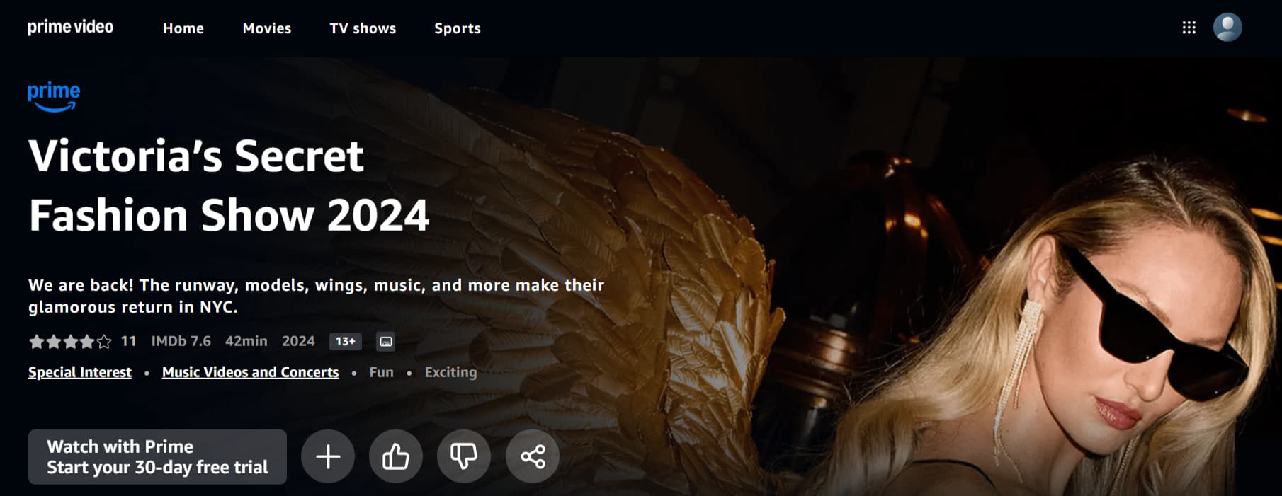 In Fashion und Beauty machte Victoria’s Secret die Fashion Show vom 15. Oktober 2024 zu einem live-shoppable Broadcast über Prime Video und Social Channels. Amazon-Zuschauer:innen in den USA konnten einige Looks in Echtzeit kaufen, während die Models über den Runway liefen.