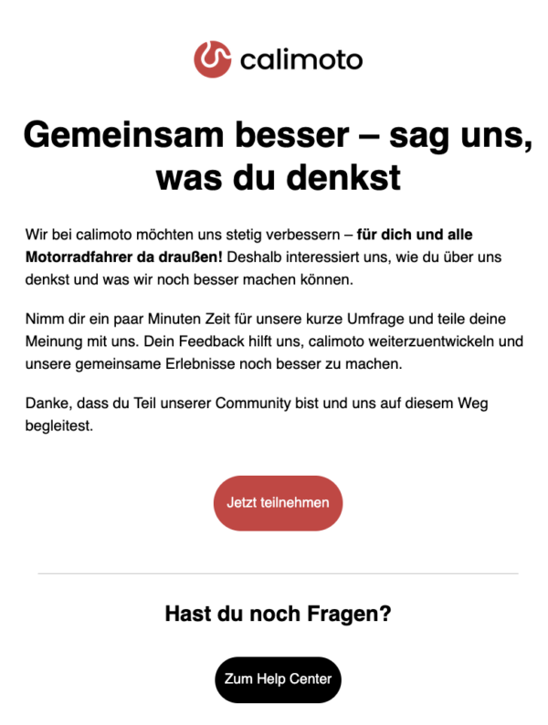 Eine Feedback-E-Mail zeigt, dass dir ihre Meinung wichtig ist, und motiviert sie gleichzeitig, eine Bewertung zu hinterlassen. Ein Gewinn für beide Seiten. Gleichzeitig liefern dir die Antworten wertvolle Einblicke in die Kundenzufriedenheit, helfen dir, Stärken und Schwächen zu erkennen, und unterstützen die Weiterentwicklung deiner Strategie.