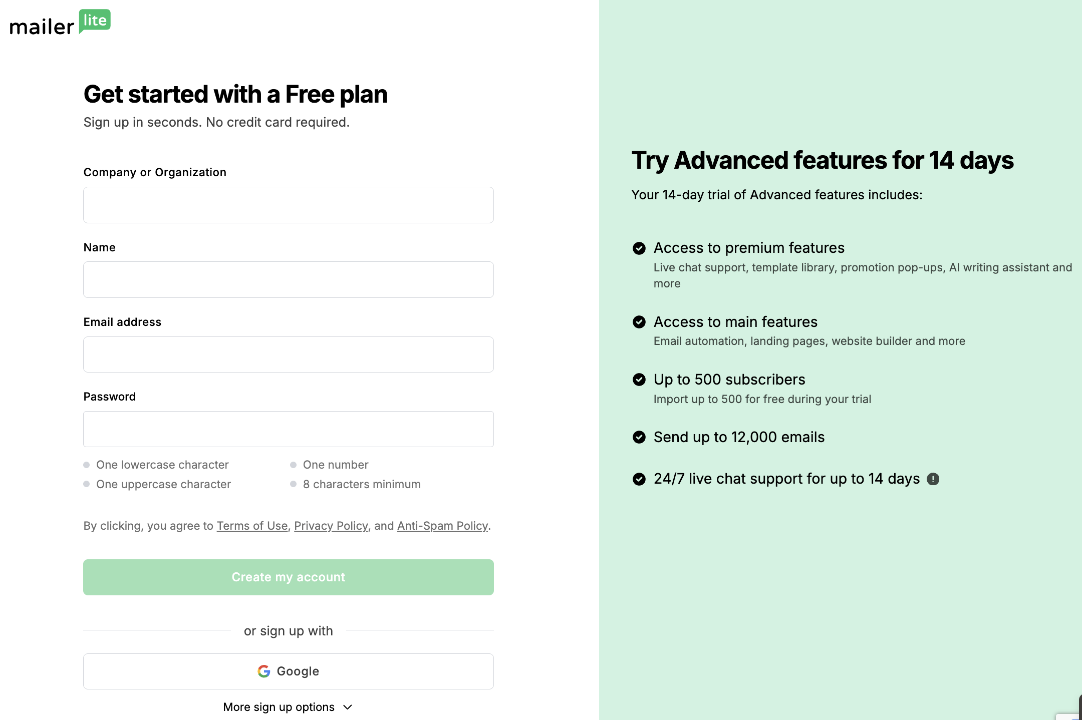 MailerLite bietet eine 14-tägige kostenlose Testversion an, die für bis zu 500 Empfänger und 12.000 E-Mails pro Monat genutzt werden kann. Für die Erstellung eines Kontos musst du keine Zahlungsdaten angeben. Die Bezahlung ist anschließend in mehreren Währungen möglich, sowohl monatlich als auch jährlich.