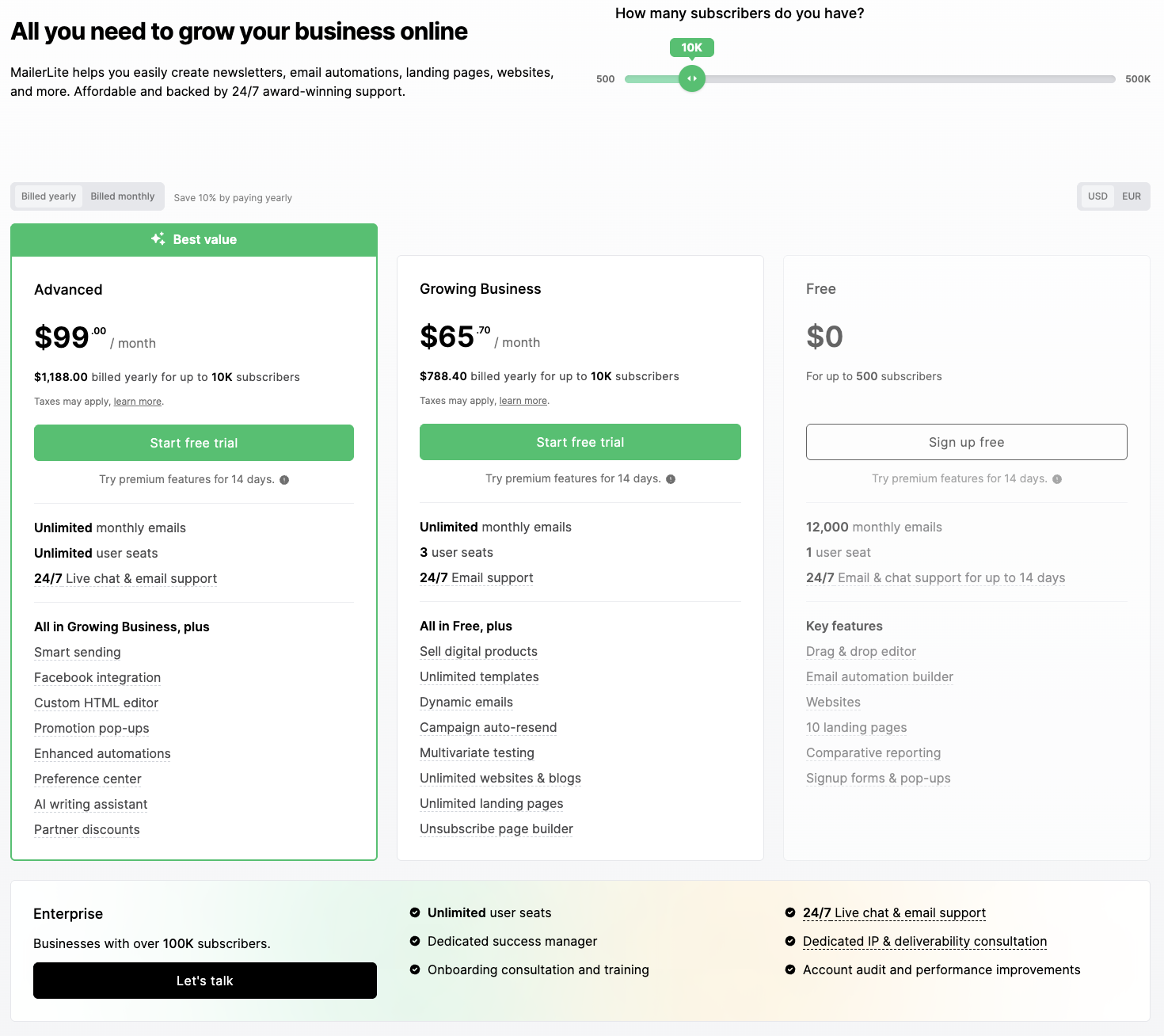 Angenommen, du hast 10.000 Empfänger, dann zahlst du zwischen 65 und 99 US-Dollar pro Monat, je nachdem, ob du dich für den Growing Business- oder den Advanced-Plan entscheidest. Das Enterprise-Paket, das Kunden mit mehr als 100.000 Empfängern zur Verfügung steht, wird anders abgerechnet, und die Kosten werden individuell festgelegt.