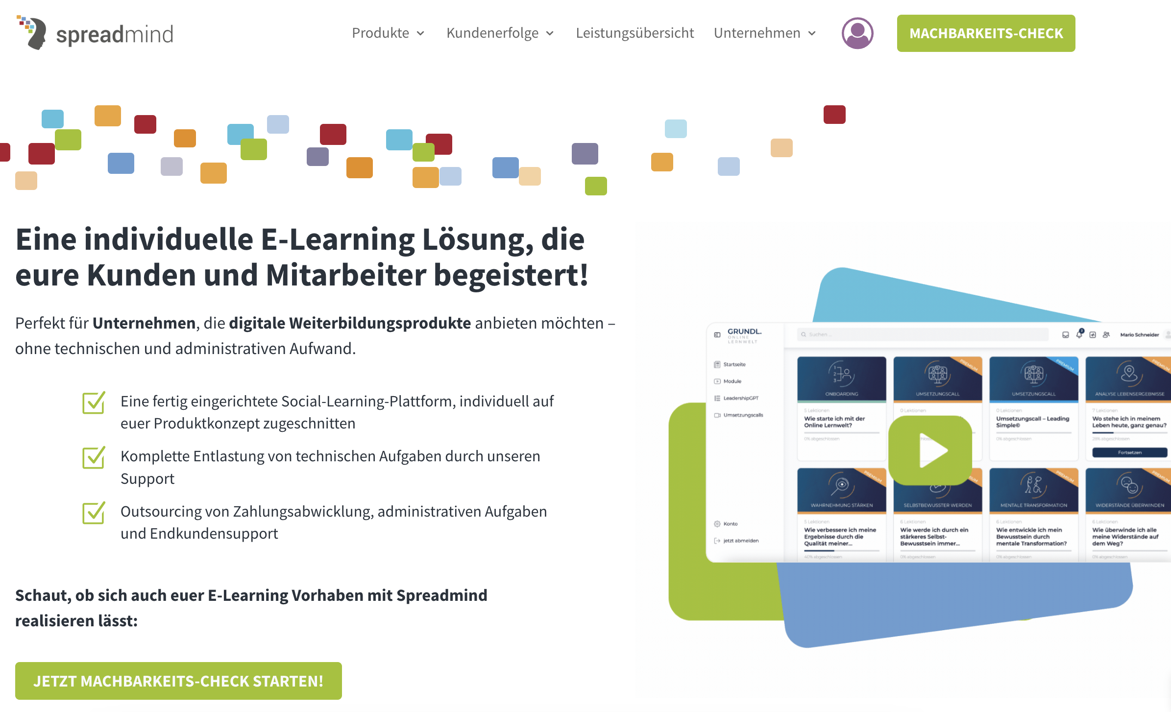 Spreadmind ist damit ein deutscher Anbieter, der den gesamten E-Learning-Prozess abdeckt: Neben Kursen und Hosting umfasst die Plattform ein vollwertiges LMS, Content- und Marketing-Funktionen sowie die komplette Zahlungsabwicklung und Rechnungsstellung inklusive länderspezifischer Steuervorgaben. Damit eignet sich Spreadmind besonders für Akademien, Bildungsanbieter und Unternehmen, die eine ganzheitliche und rechtssichere Lösung suchen.