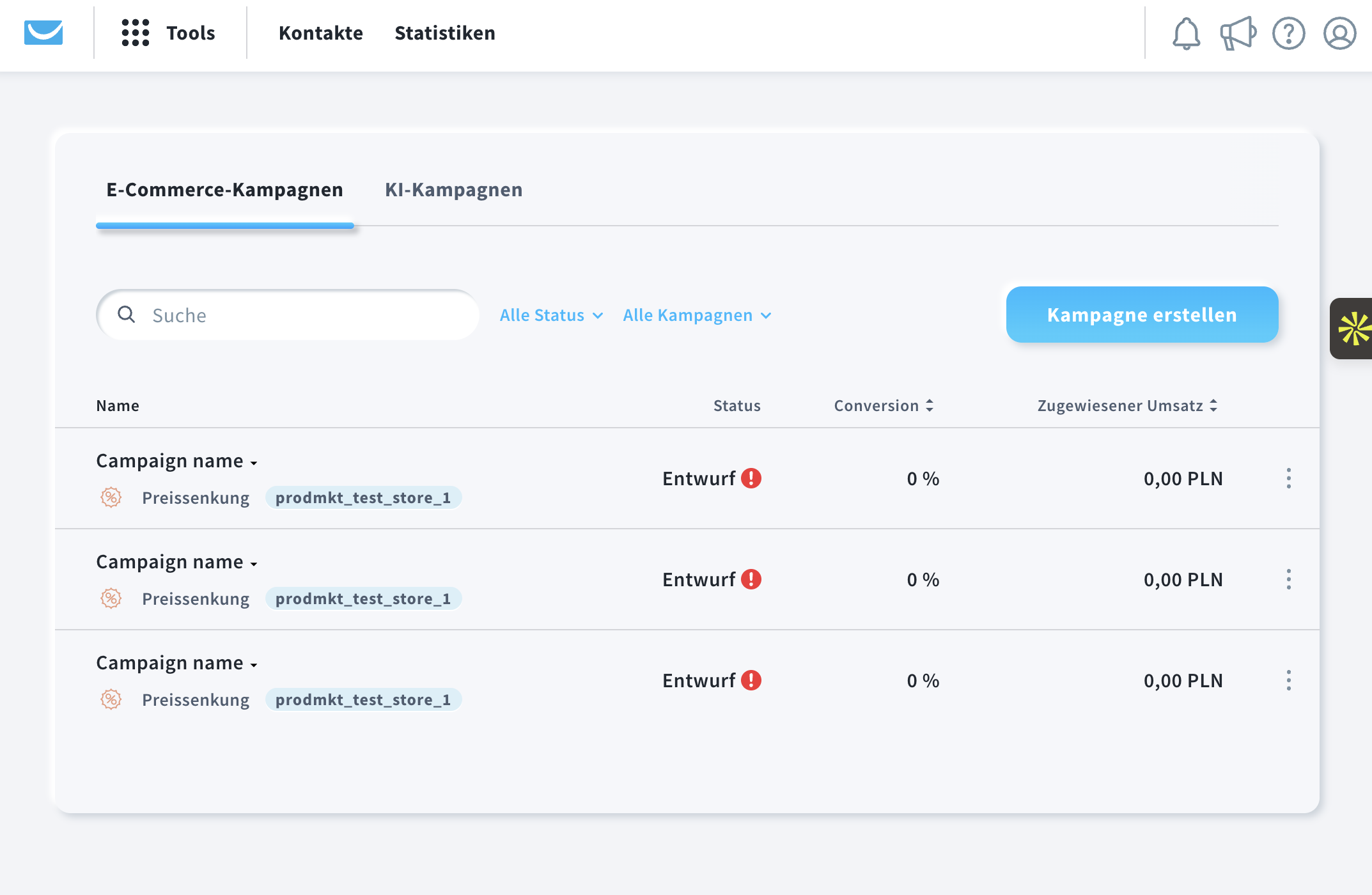 Verbinde deinen Shop, gehe zu „Kampagnen“, öffne „E-Commerce-Kampagnen“ und starte deine erste Preissenkungs-Kampagne.