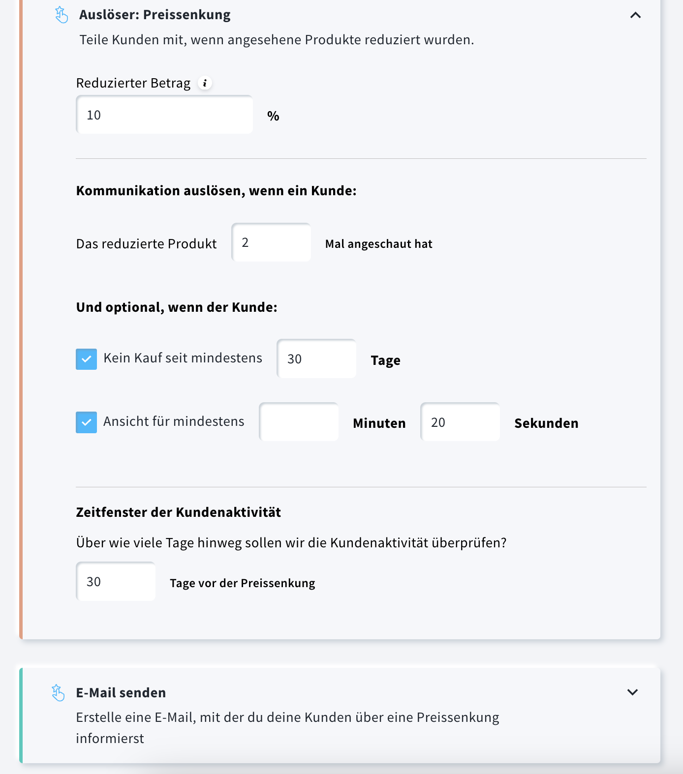 Sobald der Produktpreis um den von dir festgelegten Schwellenwert (z. B. 10 %) fällt, wird die Kampagne automatisch ausgelöst.
