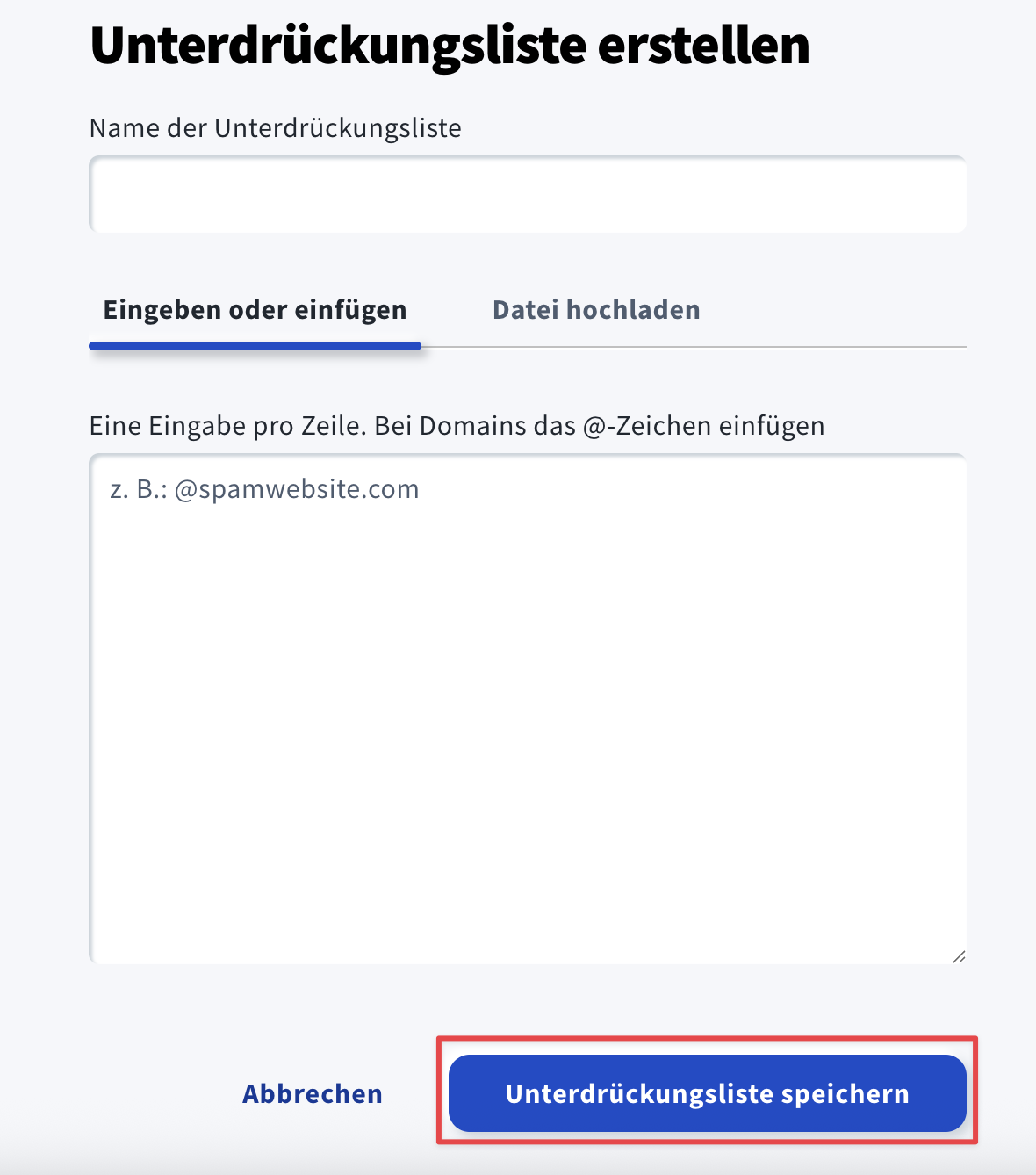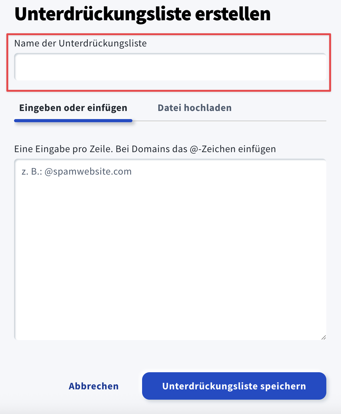 3. Es öffnet sich die Seite Unterdrückungsliste erstellen. Geben Sie den Namen Ihrer Unterdrückungsliste ein (erforderlich). Der Listenname kann zwischen 1 und 64 Zeichen lang sein. Alle Zeichen sind erlaubt, jedoch darf der Listenname nicht nur aus einem Leerzeichen bestehen. Emojis werden in einen Unterstrich (_) umgewandelt.