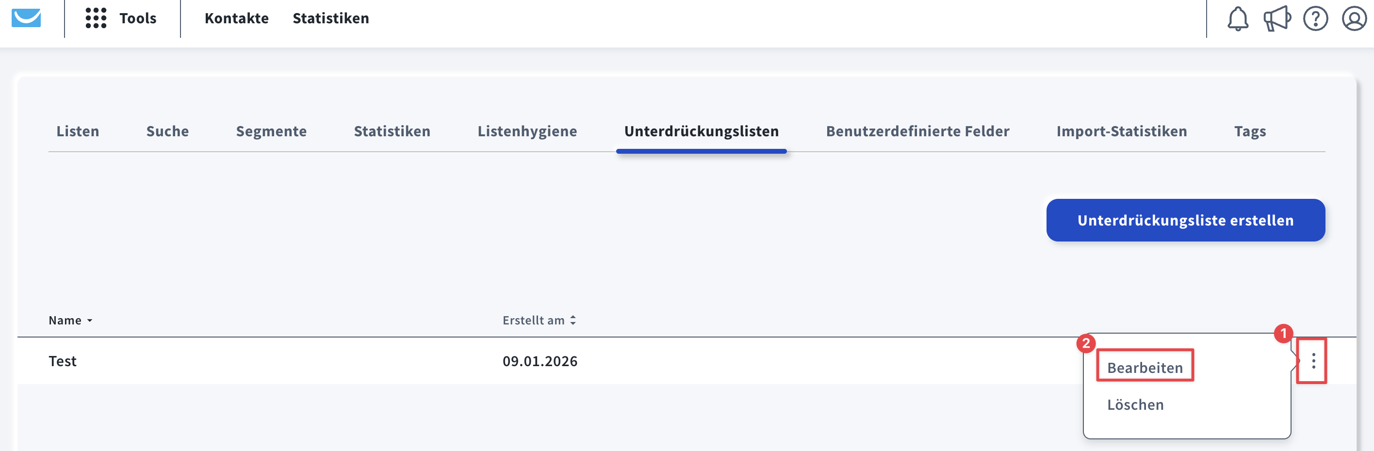 Sie können Ihre Listen auf der Seite Unterdrückungslisten bearbeiten und löschen.