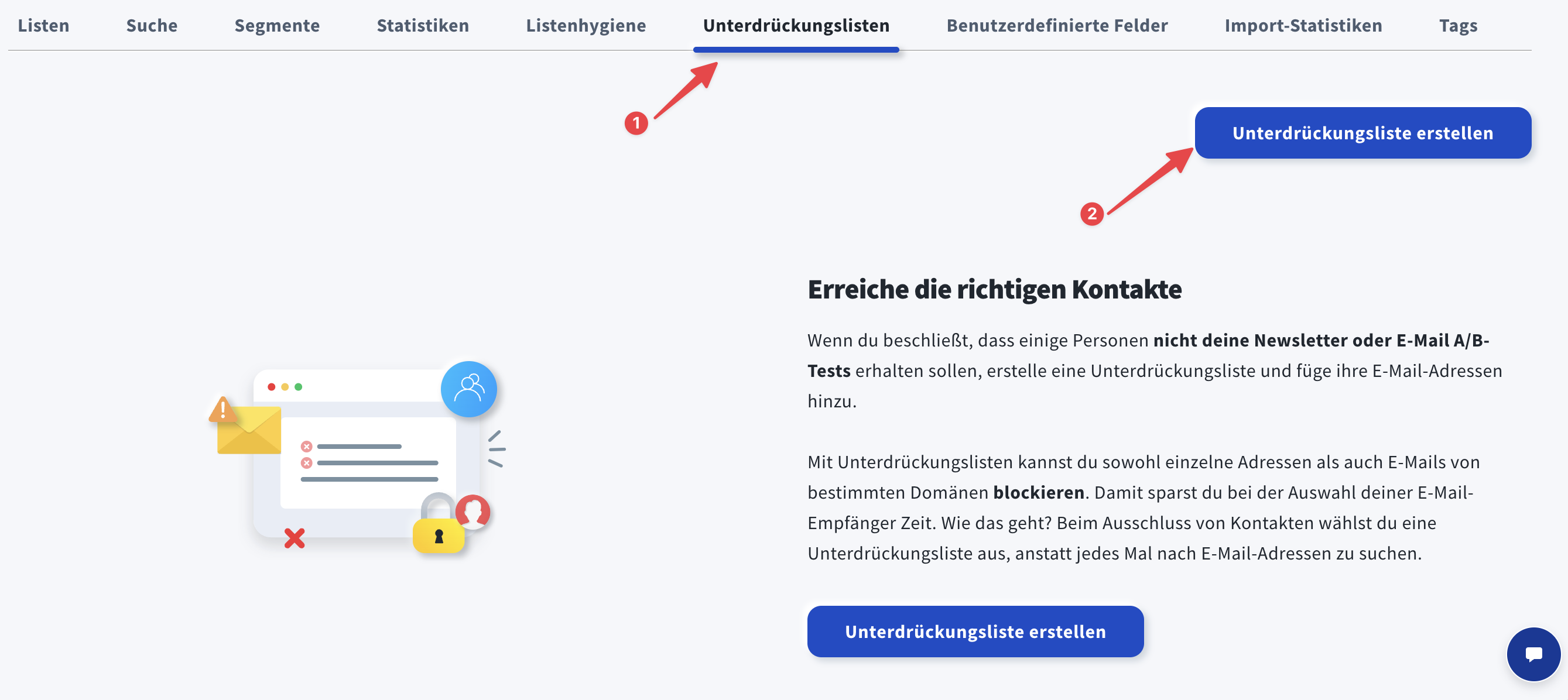 Unterdrückungslisten sind eine praktische Möglichkeit, sicherzustellen, dass Sie keine Updates zu Produkten oder Dienstleistungen an Empfänger senden, die den Erhalt solcher Nachrichten abgelehnt haben. Gehen Sie einfach zu Kontakte > Unterdrückungslisten und klicken Sie auf die Schaltfläche Unterdrückungsliste erstellen, um sie einzurichten. Wählen Sie die Liste anschließend aus, wenn Sie im Newsletter-Editor die Empfänger festlegen.