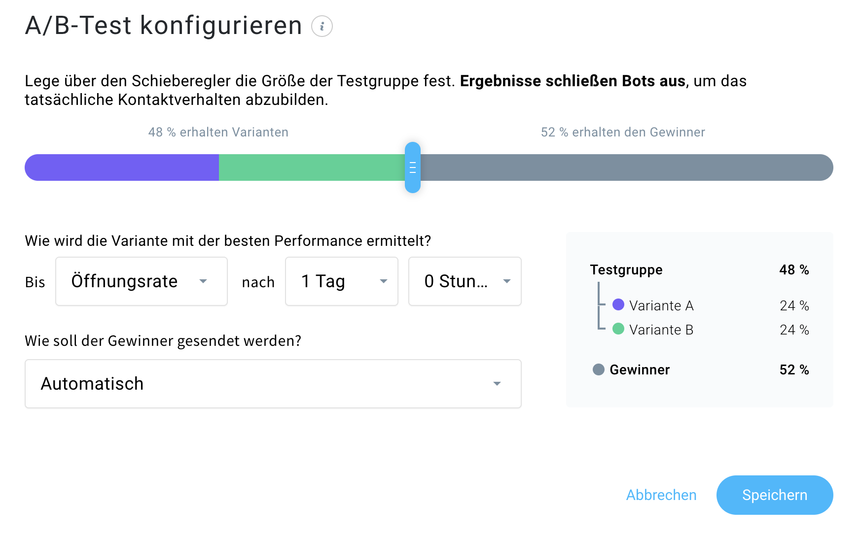 Hinweis: Während der Testphase werden nur die Aktionen echter Benutzer berücksichtigt. Öffnungen oder Klicks, die von Bots stammen, werden nicht einbezogen. - Wähle, ob wir die Gewinner-Nachricht automatisch an den Rest der Gruppe senden sollen oder ob du dies lieber manuell tun möchtest (nur anwendbar, wenn weniger als 100 % der Kontakte für den Test ausgewählt sind). Entscheide anschließend, welches Kriterium als Gewinnfaktor gelten soll (Öffnungsrate oder Klickrate) und nach welcher Zeit der Test enden soll. Wir zeigen dir eine kurze Zusammenfassung deiner Testgruppe. Wenn du fertig bist, klicke auf Speichern.