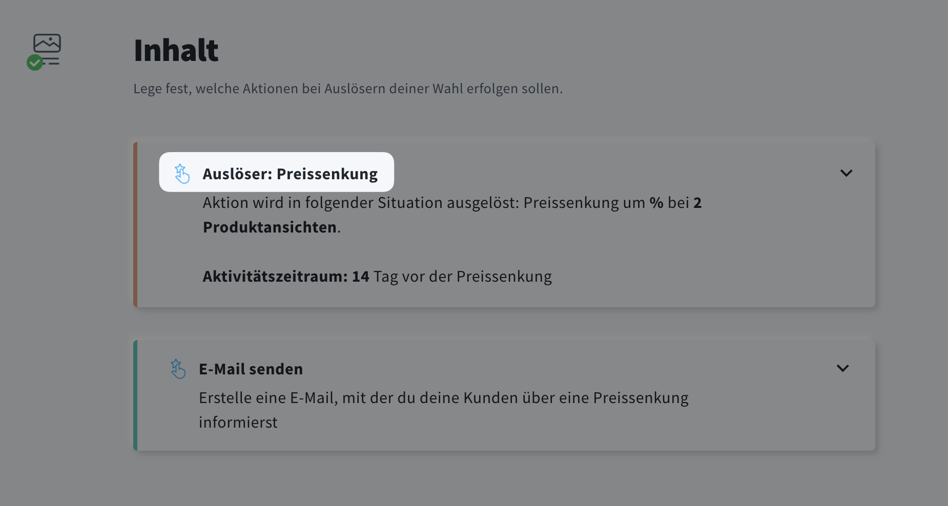 - Der Abschnitt Inhalt enthält nun einen Trigger für Preissenkung und eine Aktion zum E-Mail senden. Klicken Sie auf die Kachel Preissenkung, um die Trigger-Einstellungen zu erweitern.