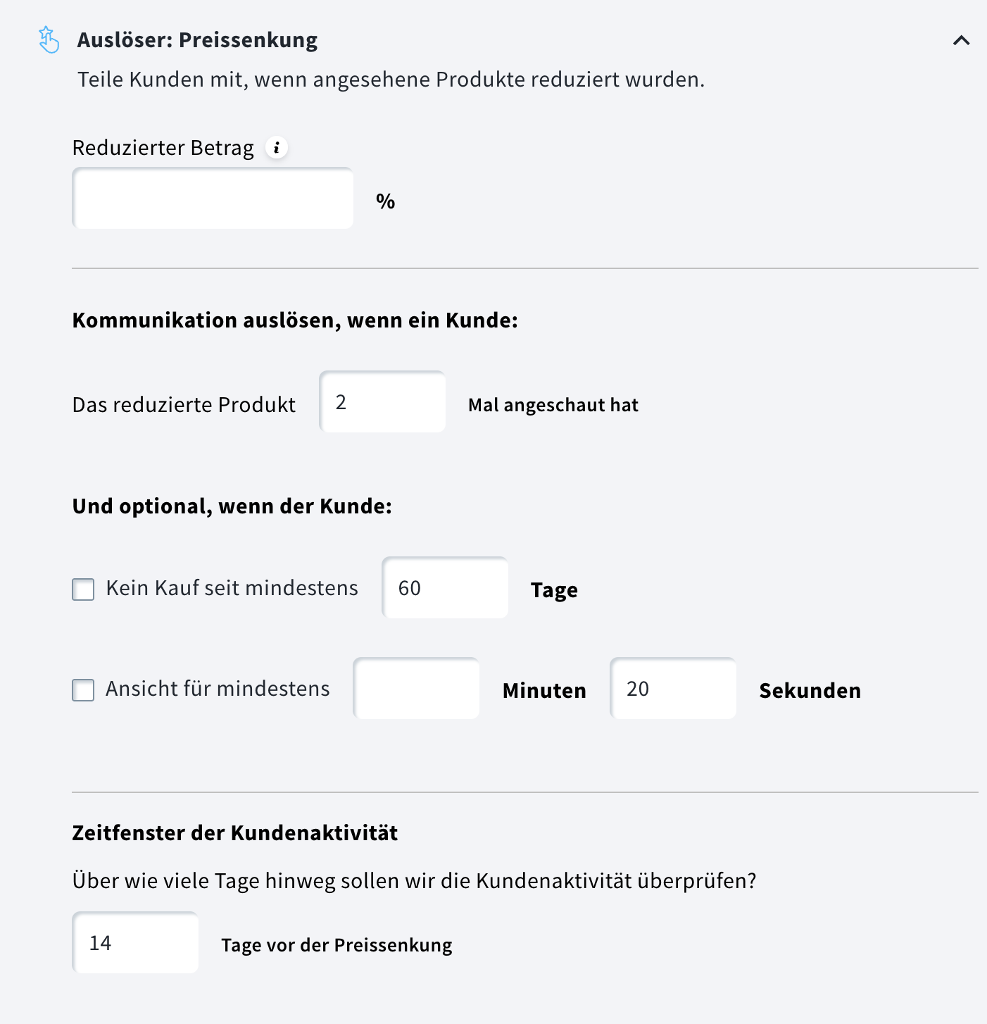 bevor das Tracking ausgelöst wird - Entscheiden Sie, nach wie vielen Produktaufrufen Sie die Preissenkung-