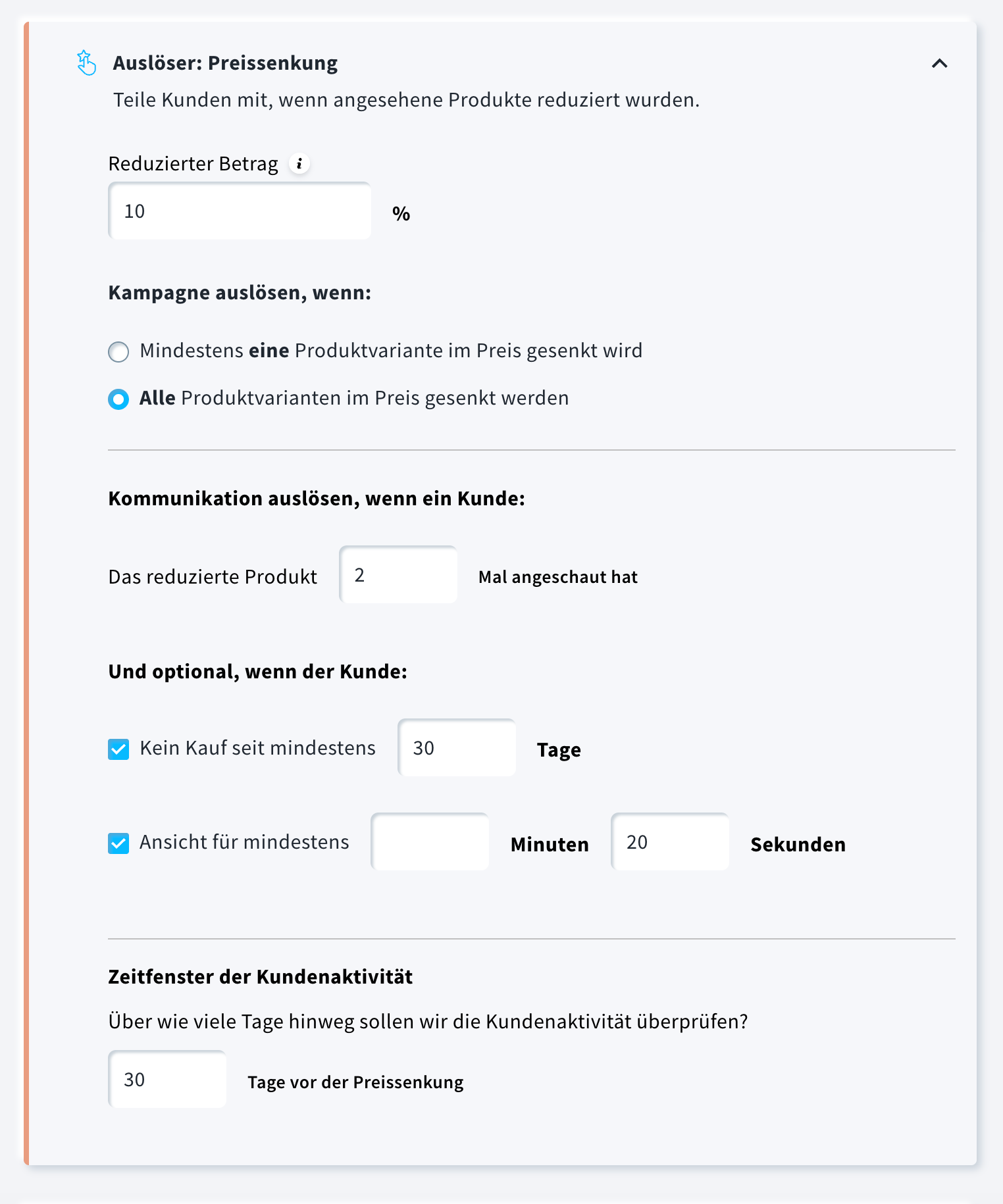 - Wählen Sie im Abschnitt Inhalt den Kampagnen-Trigger: Preissenkung.