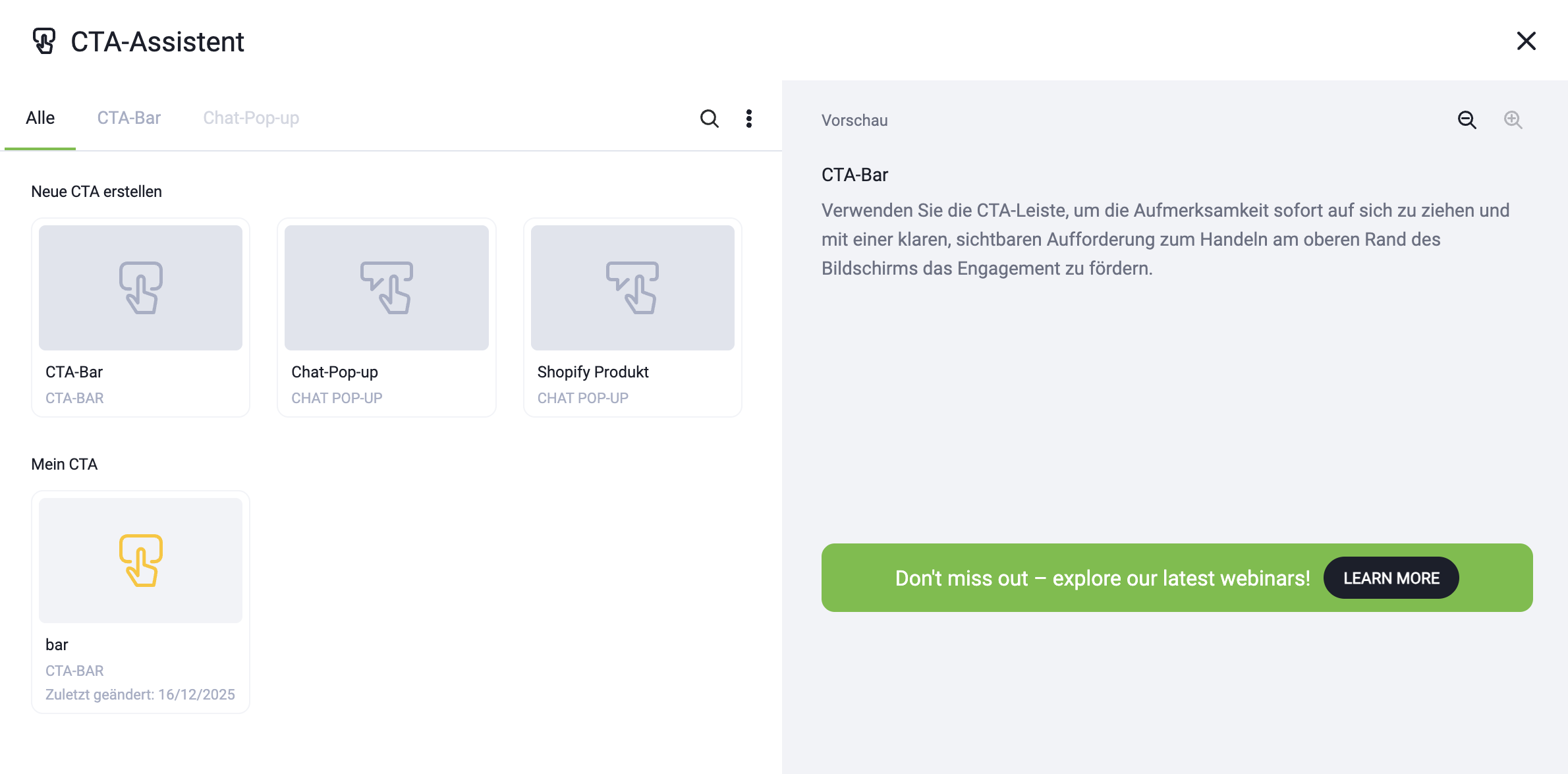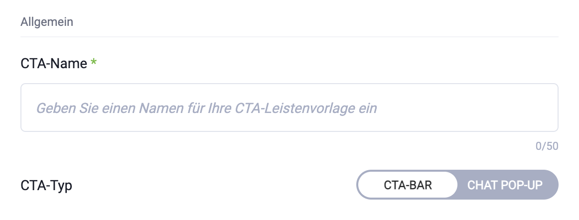 - wählen Sie den CTA-Typ – Sie können zwischen CTA-Bar und Chat-Pop-up wechseln