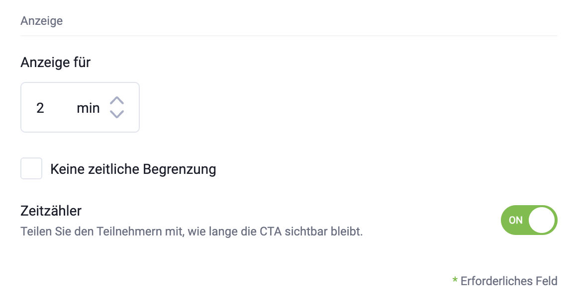 - Im Abschnitt Anzeige ist die Option Keine zeitliche Begrenzung standardmäßig aktiviert, was bedeutet, dass Ihr CTA dauerhaft sichtbar ist. Sie können diese Option deaktivieren und festlegen, wie lange er angezeigt werden soll, und außerdem entscheiden, ob Teilnehmer über die Anzeigedauer informiert werden sollen.