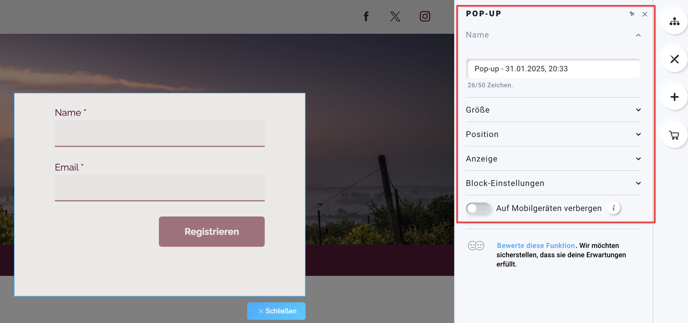 Hinweis: Pop-ups, die in den Anzeigeeinstellungen auf Beim Verlassen eingestellt sind, werden auf mobilen Geräten nicht angezeigt, da es dort nicht möglich ist, das Verhalten der Besucher zu verfolgen. Aus diesem Grund ist es eine gute Idee, die Option Auf Mobilgeräten verbergen für Pop-ups bei Beim Verlassen zu aktivieren.