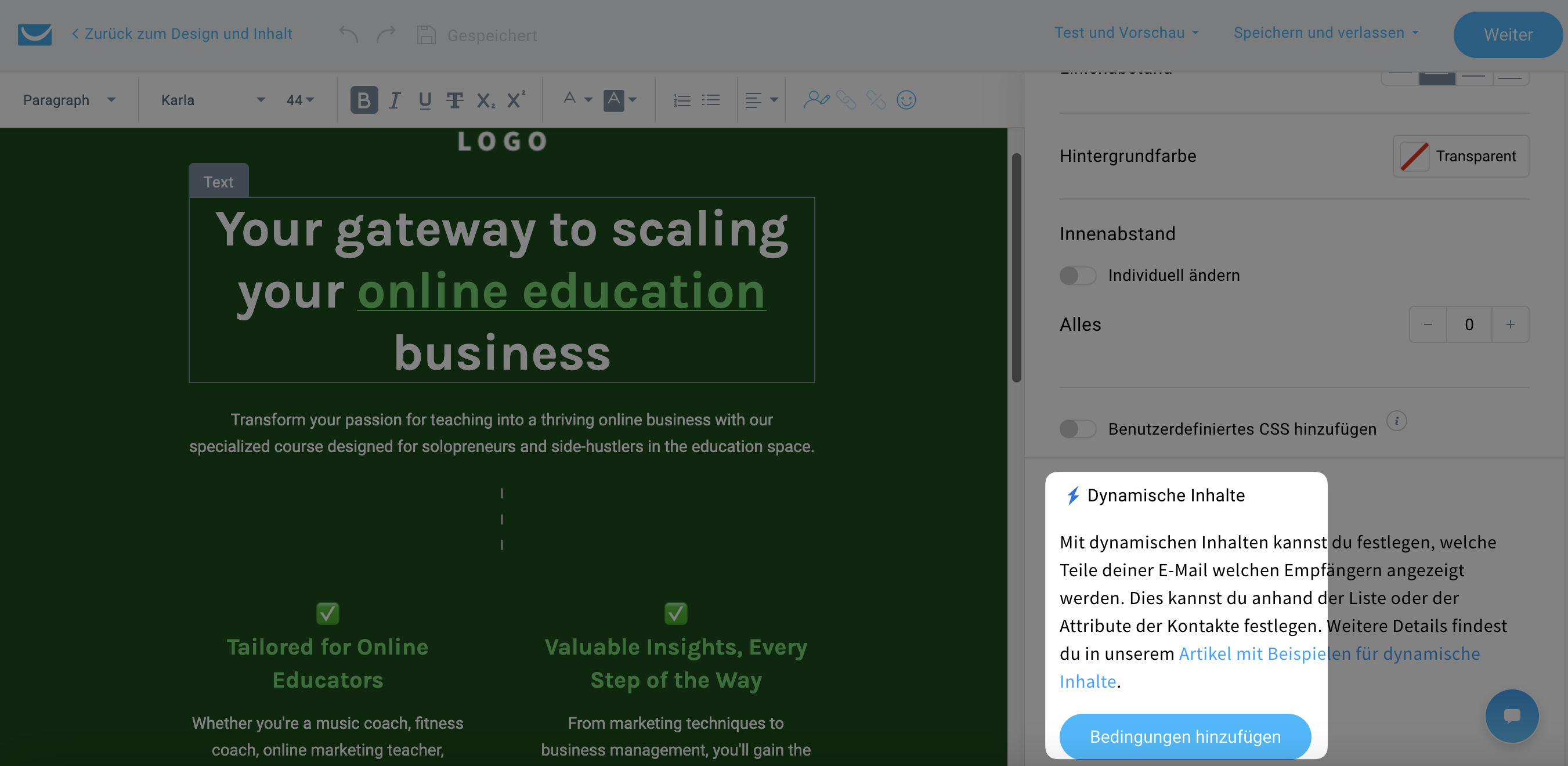 Mit dynamischen Inhalten kannst du den Empfängern, die bestimmte Kriterien erfüllen, Elemente deiner Nachricht anzeigen. Du kannst zum Beispiel personalisierte Angebote, Grüße oder Produktempfehlungen anzeigen, die von den Tags oder den benutzerdefinierten Feldern.