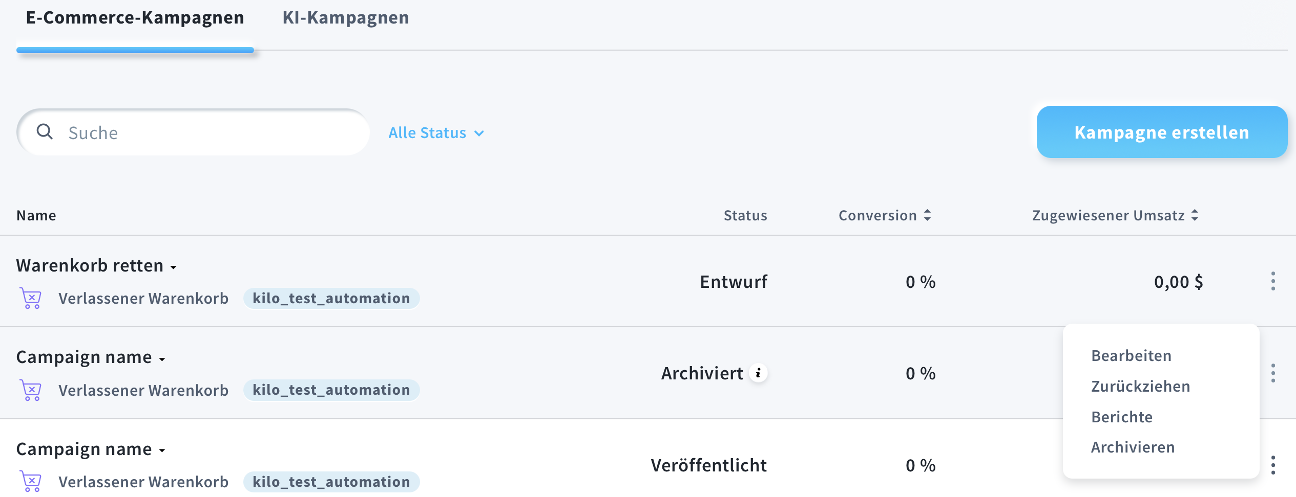 - Sie sehen Ihre Kampagnen zusammen mit ihrem Status (Entwurf, Veröffentlicht, Pausiert oder Archiviert) sowie grundlegenden Statistiken (Conversion und Zugewiesener Umsatz).