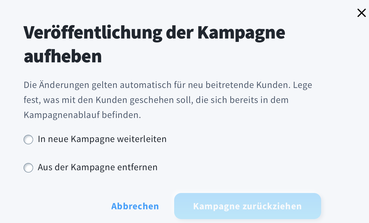 - Zurückziehen – um Ihre Kampagne auf einen Entwurf zurückzusetzen. Nachdem Sie darauf geklickt haben, müssen Sie entscheiden, ob Sie die Kampagne weiterhin für Kunden aktiv halten möchten, die bereits im Kampagnenfluss sind.