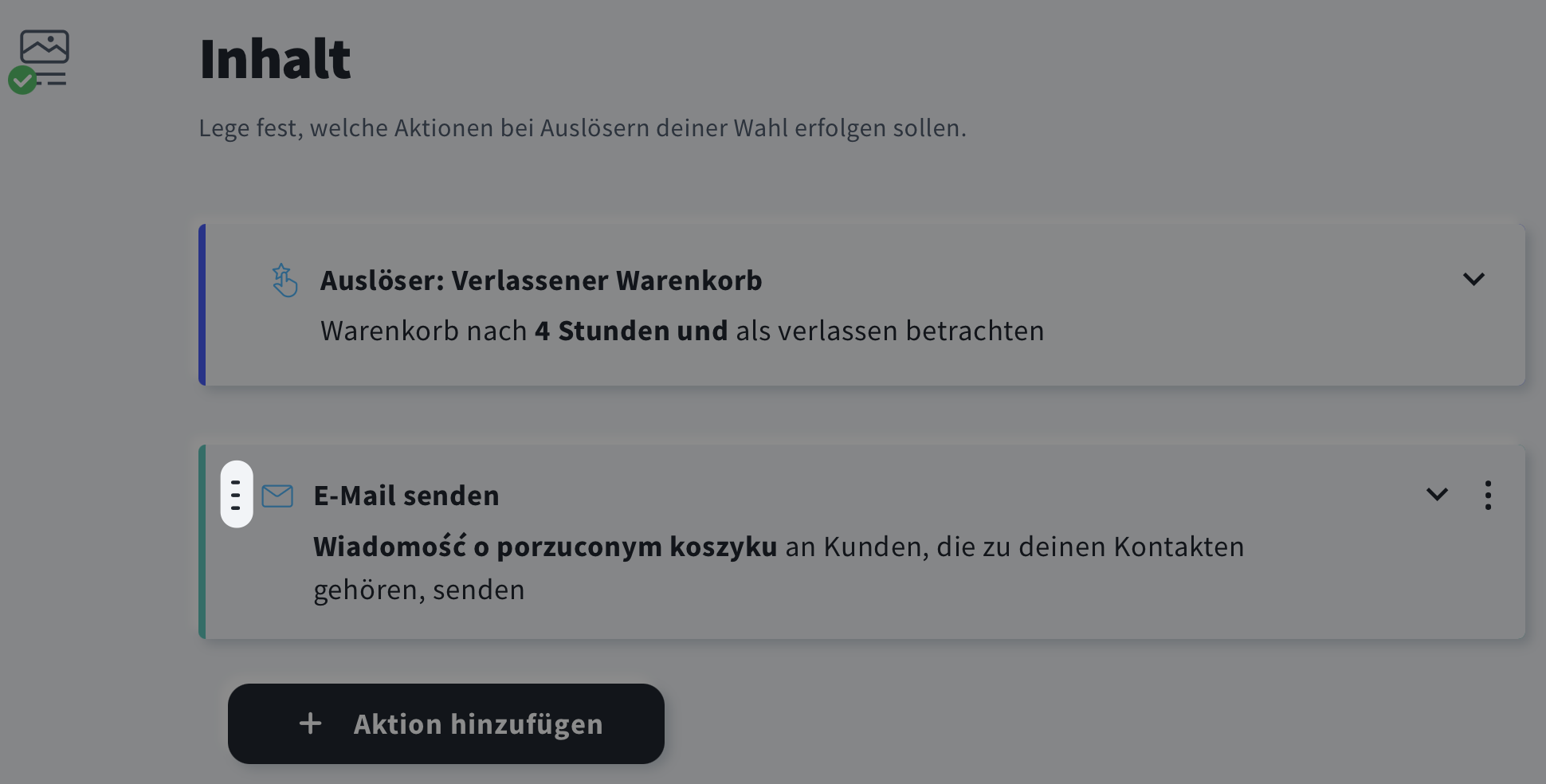 - Ändern der Reihenfolge der Kampaktionen – klicken und halten Sie das Symbol, das auf der linken Seite jeder Aktion erscheint, wenn Sie mit der Maus darüber fahren. Ziehen Sie dann die Aktion nach oben oder unten, um sie nach Belieben neu anzuordnen.