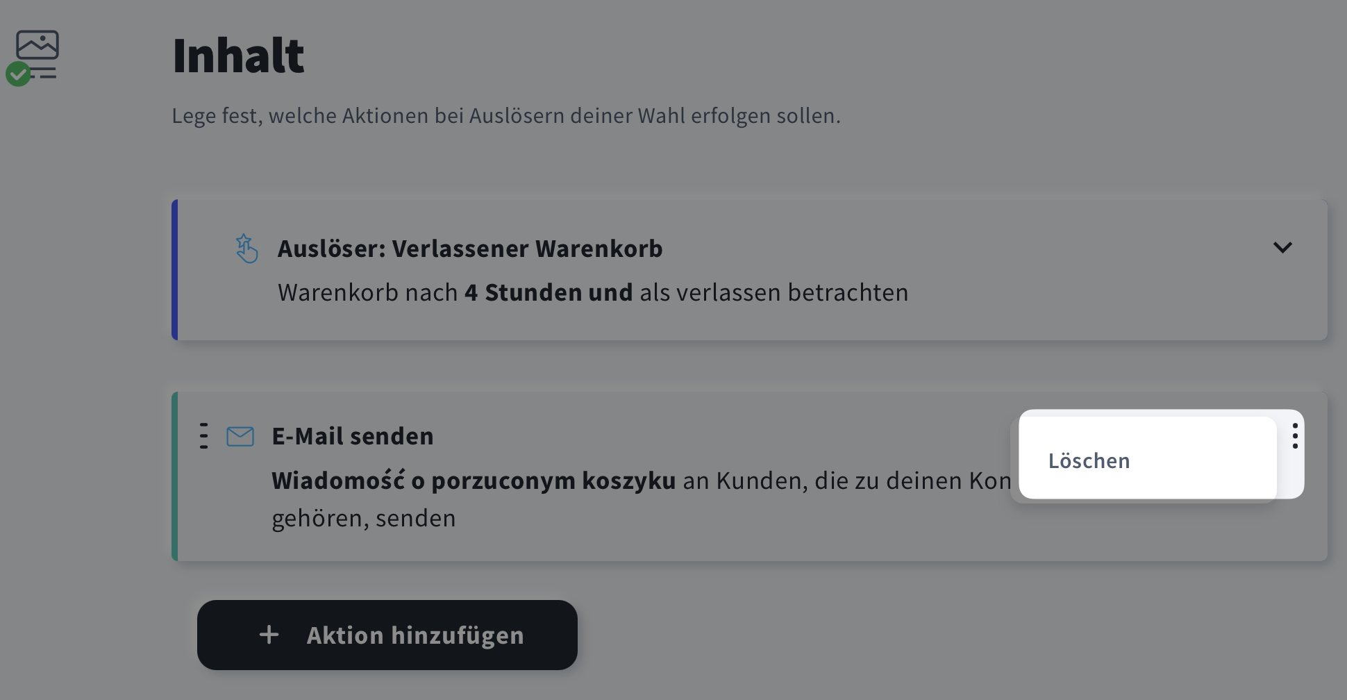 - Aktion löschen – verwenden Sie das Symbol, das in der rechten Ecke der Aktion erscheint, die Sie entfernen möchten, und klicken Sie auf Löschen.