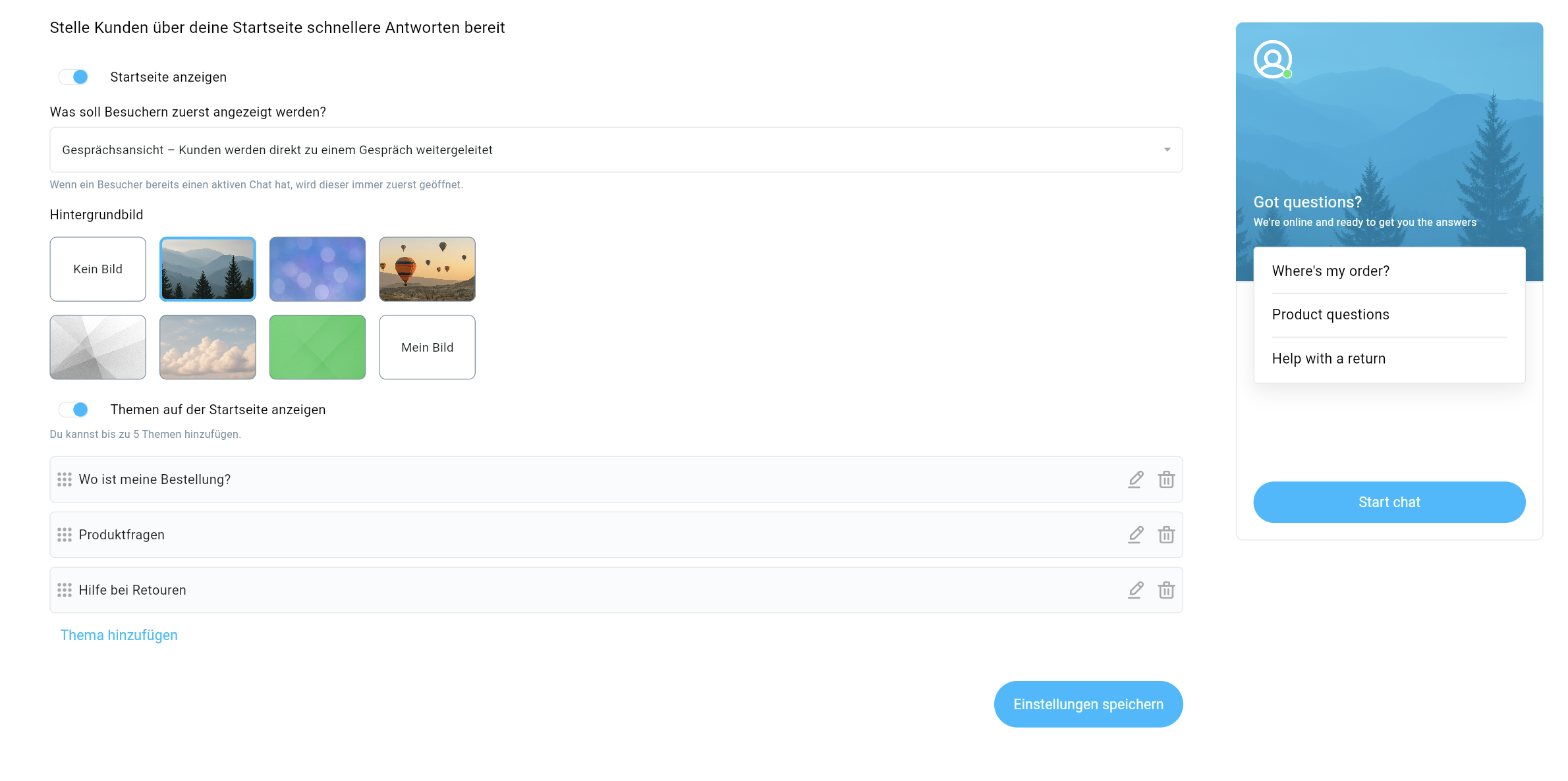 - Chat-Startseite – Kunden sehen zuerst die Startseite