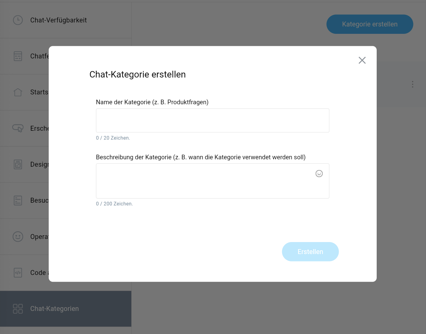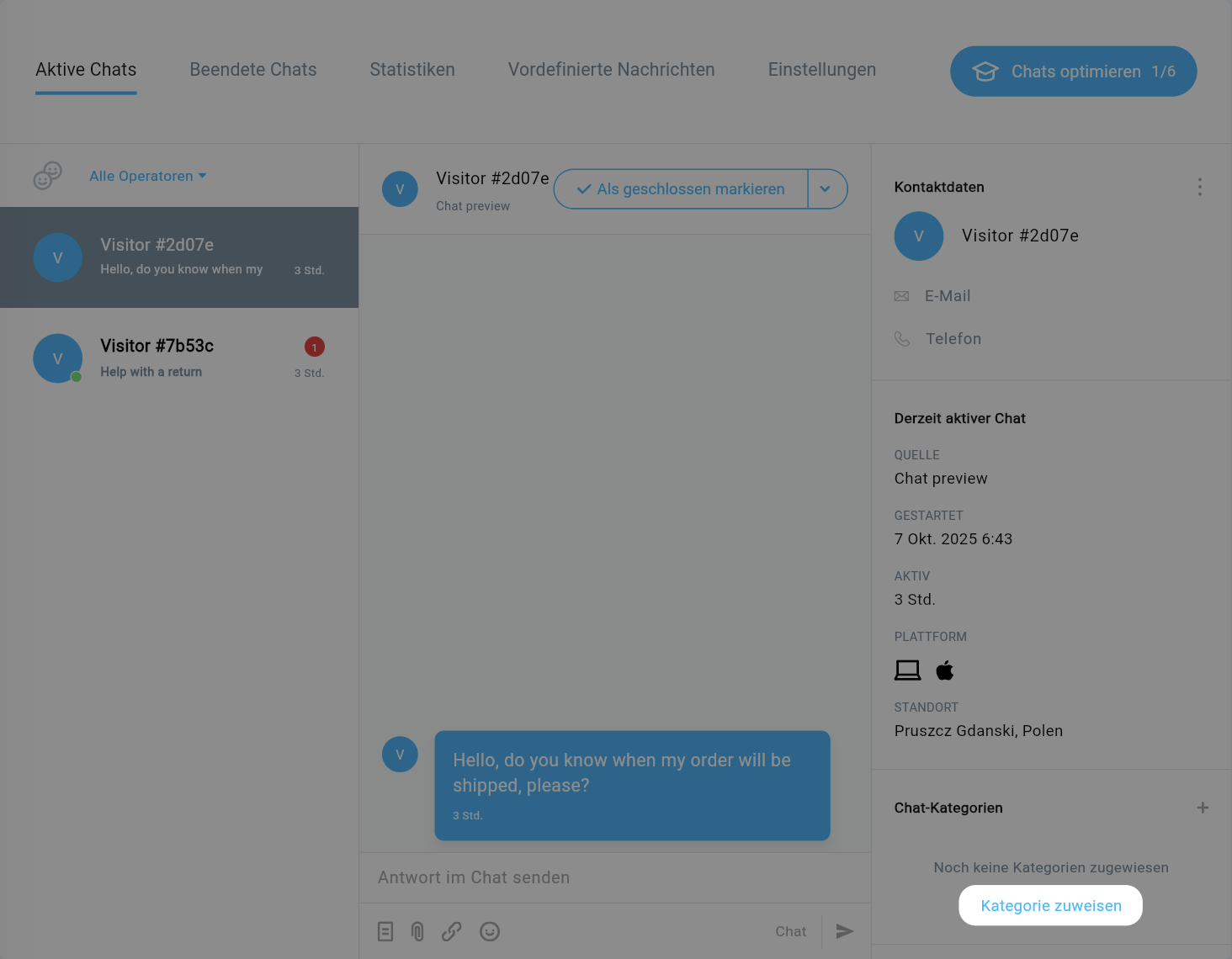 Sie können Konversationen Kategorien zuweisen, um zu analysieren, welche Themen und Anliegen der Besucher am beliebtesten und wichtigsten sind.