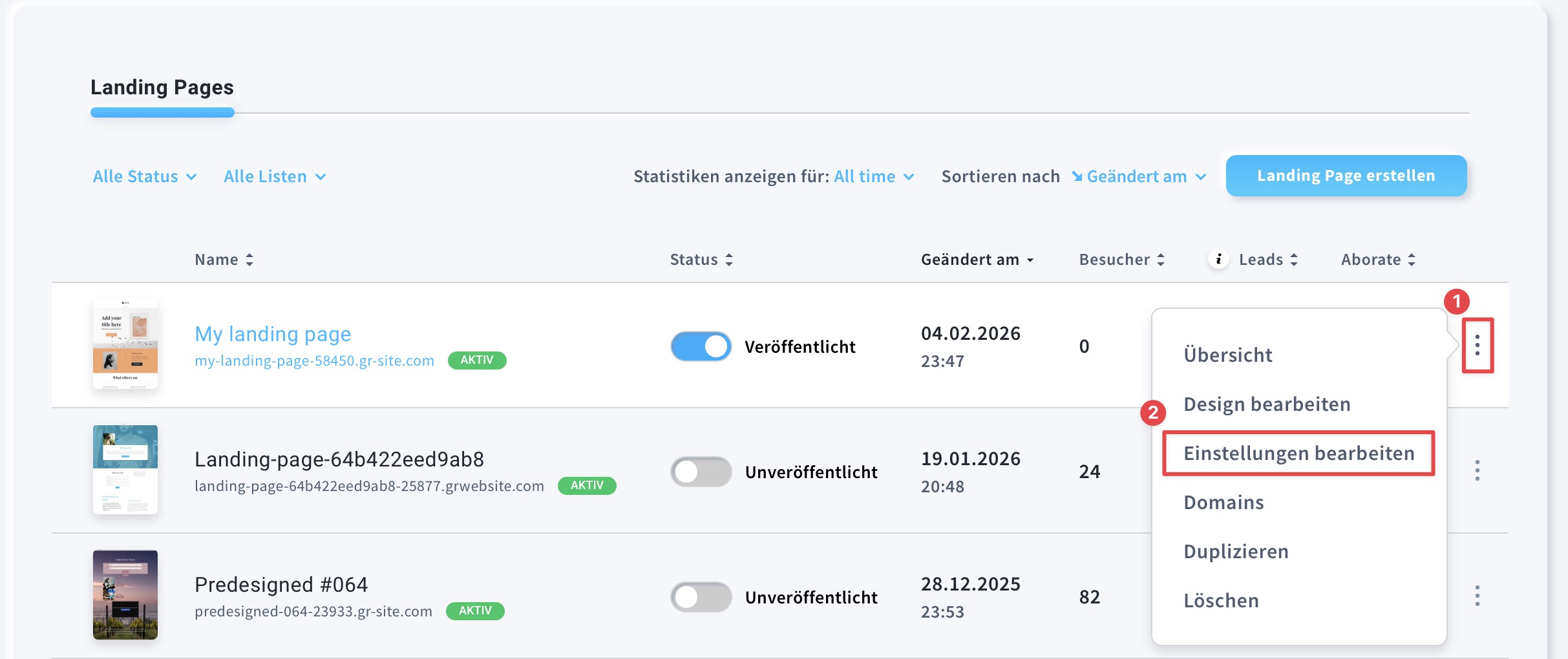 - Wählen Sie Ihre Landingpage aus, fahren Sie mit der Maus über das Aktionsmenü und wählen Sie Einstellungen bearbeiten.