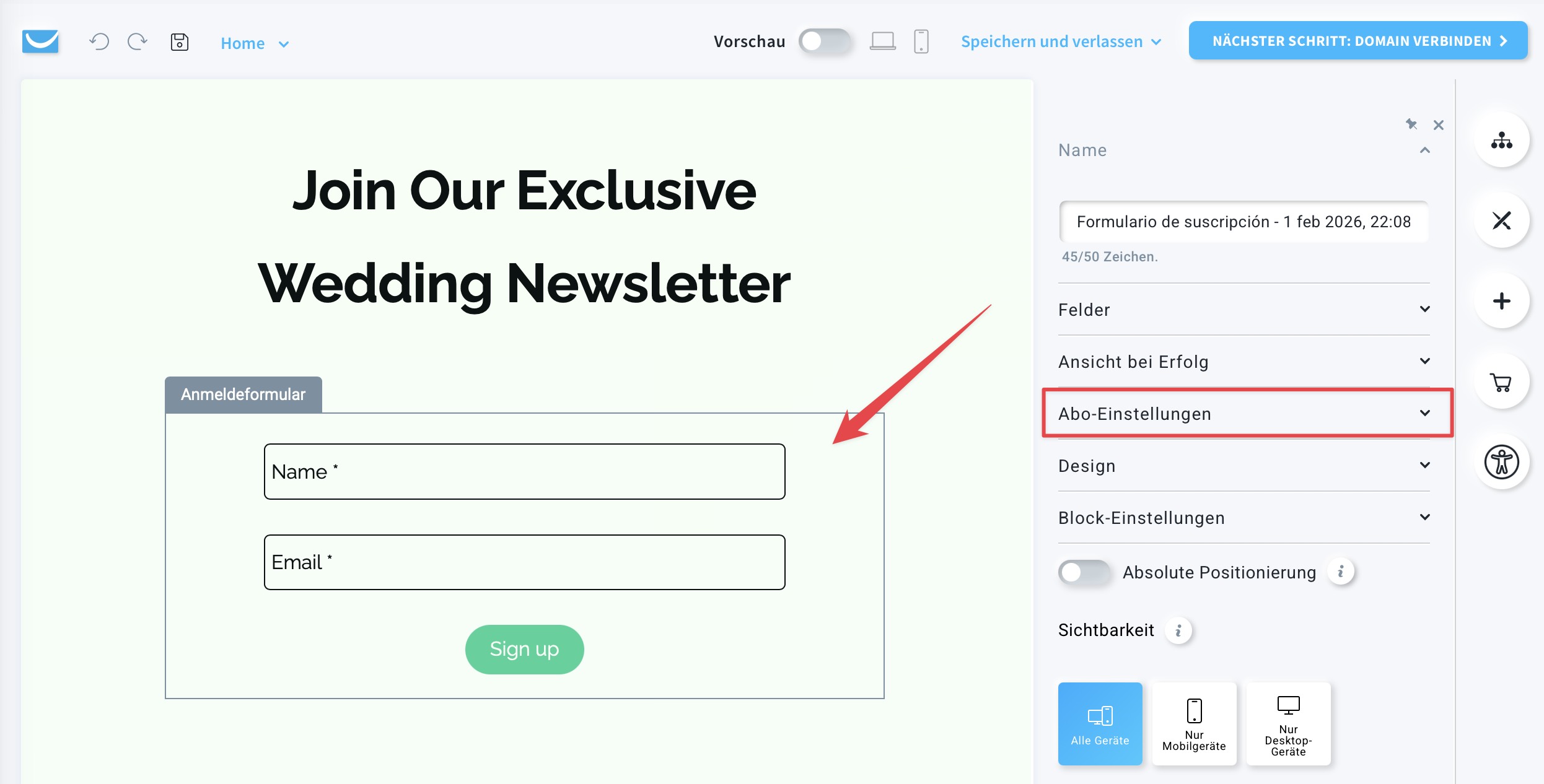 - Klicken Sie auf das Element des Anmeldeformulars und öffnen Sie den Reiter Abo-Einstellungen.