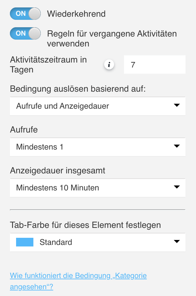 Die Anzeigedauer bezieht sich auf die gesamte Zeit, die ein Besucher mit dem Betrachten der Kategorie verbringt. Der Aktivitätszeitraum legt fest, welche Aufrufe in die Berechnung einfließen. - Aufrufe und Anzeigedauer – beide Bedingungen müssen erfüllt sein, damit der Besucher zum nächsten Element übergehen kann.