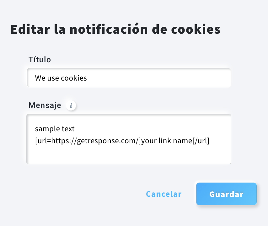 Le ofrecemos la opción de habilitar un banner de cookies en GetResponse para ayudarle a cumplir con estas normativas, pero no garantizamos que seguir nuestros consejos ni usar nuestra barra de plantilla asegure su total cumplimiento con las leyes aplicables al uso de cookies en sitios web. Le recomendamos buscar asesoría legal sobre los requisitos exactos referentes al uso de cookies.