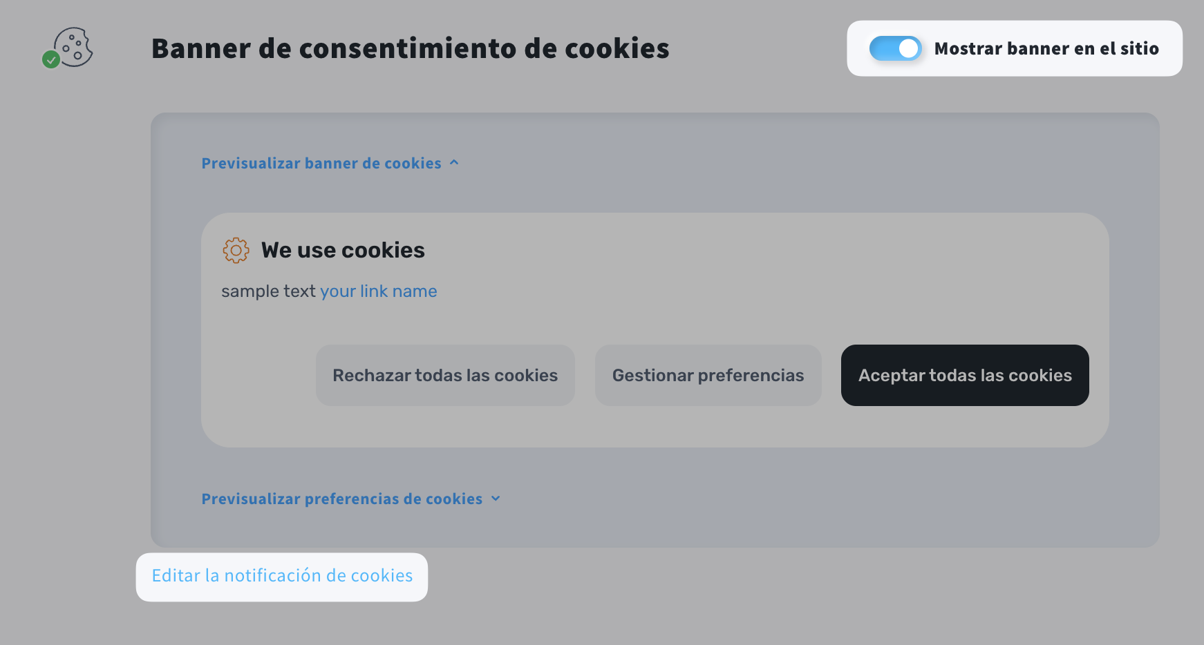 - Desplácese hacia abajo hasta la sección Banner de consentimiento de cookies y active la opción Mostrar banner en el sitio.