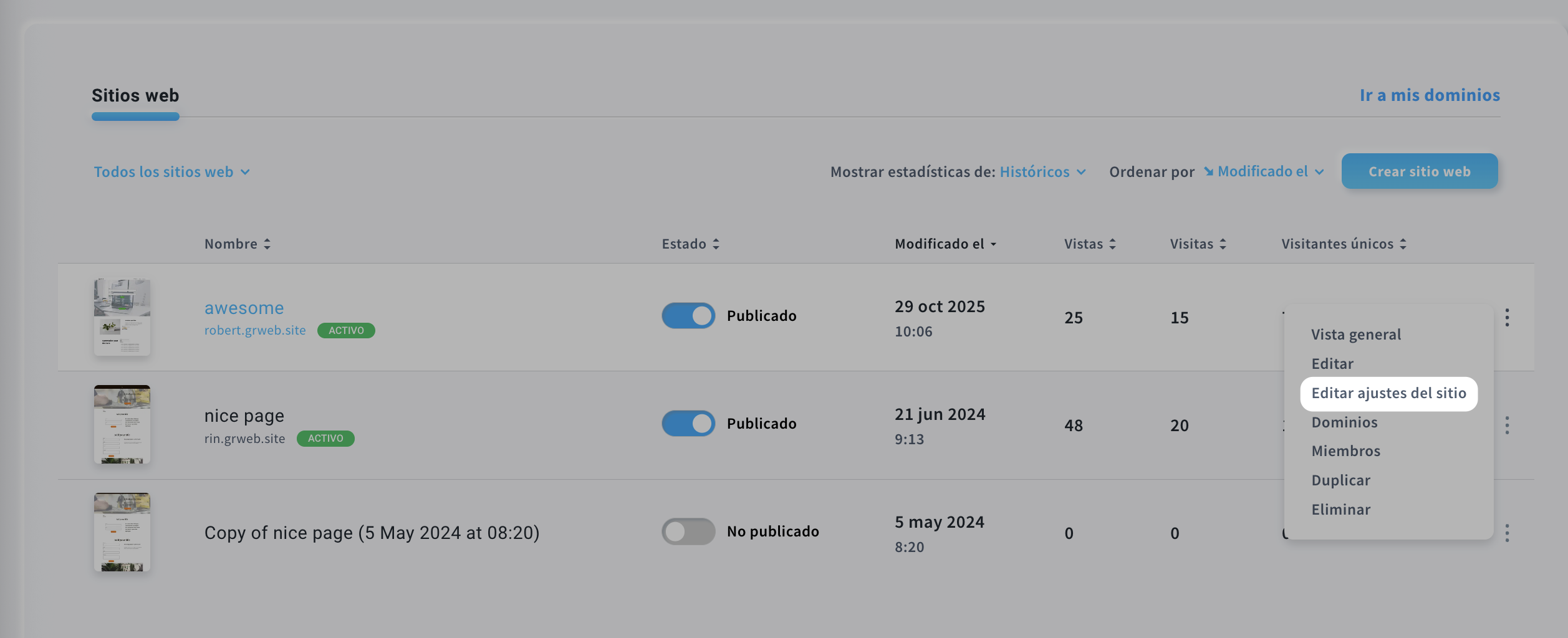 - Pase el cursor sobre los 3 puntos verticales junto a su sitio web.