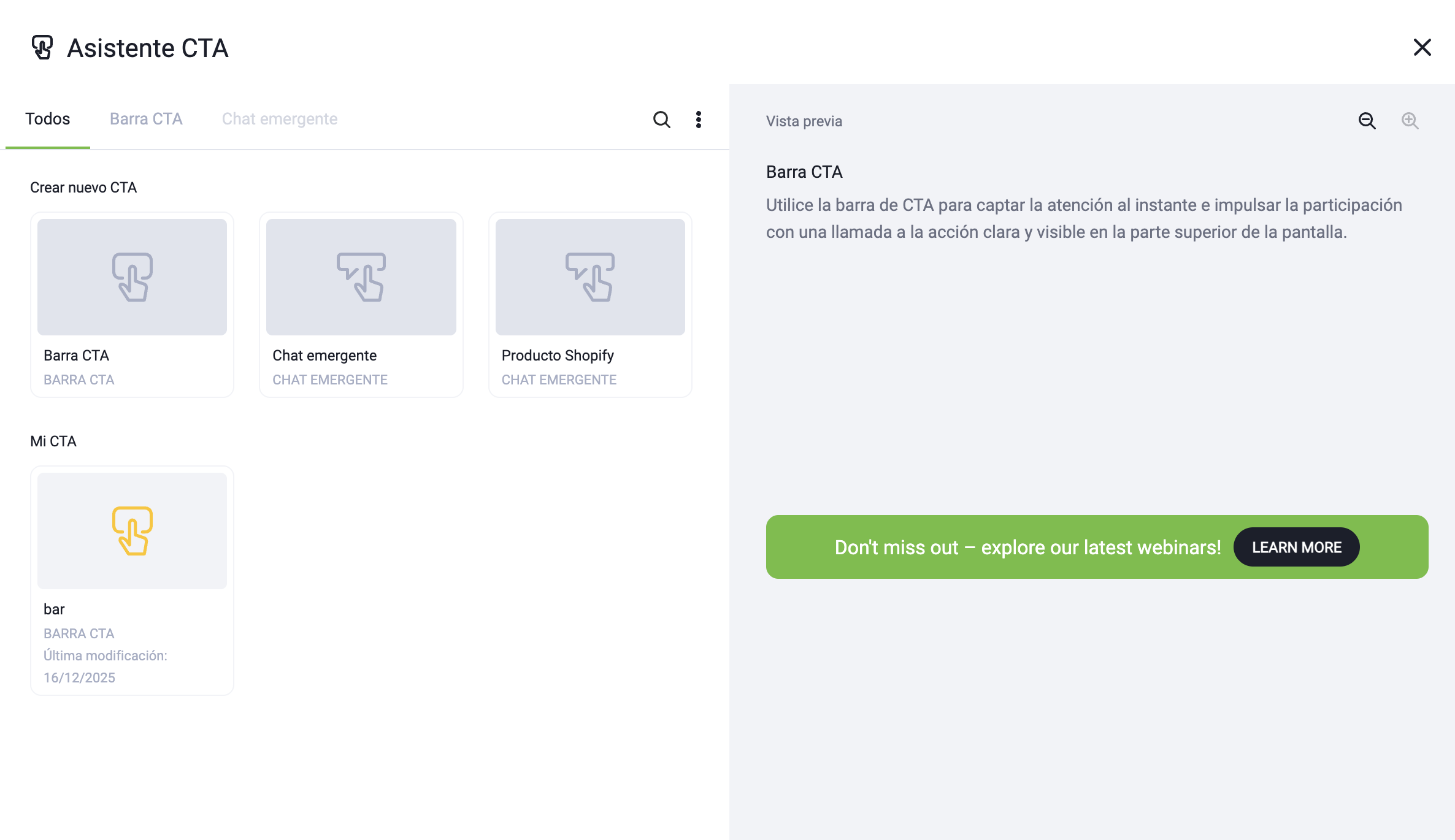 - selecciona el Tipo de CTA; puedes alternar entre CTA Bar y Chat Pop-up