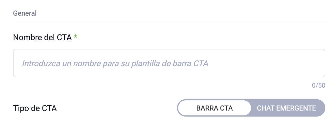 - introduce el Nombre del CTA, visible internamente para tu plantilla de barra/pop-up