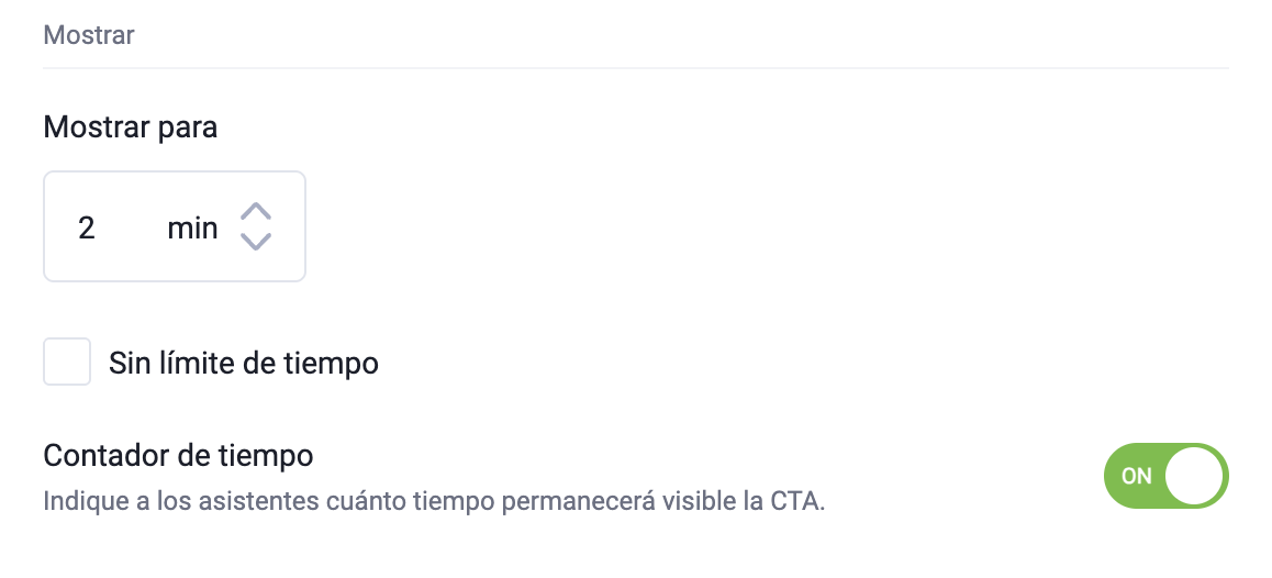 - En la sección Monstar, la opción Sin límite de tiempo está activada por defecto, lo que significa que tu CTA será visible todo el tiempo. Puedes desmarcar esta opción y establecer durante cuánto tiempo se mostrará, así como decidir si deseas informar a los participantes sobre la duración de la visibilidad del CTA.