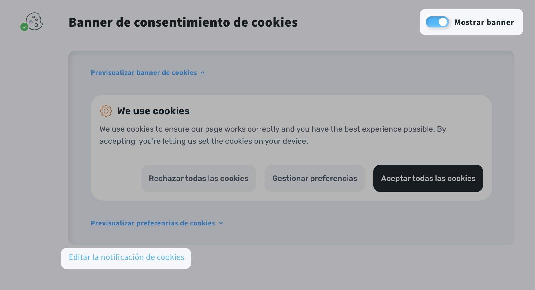 - Navega hasta la sección Banner de consentimiento de cookies y activa la opción Mostrar banner.