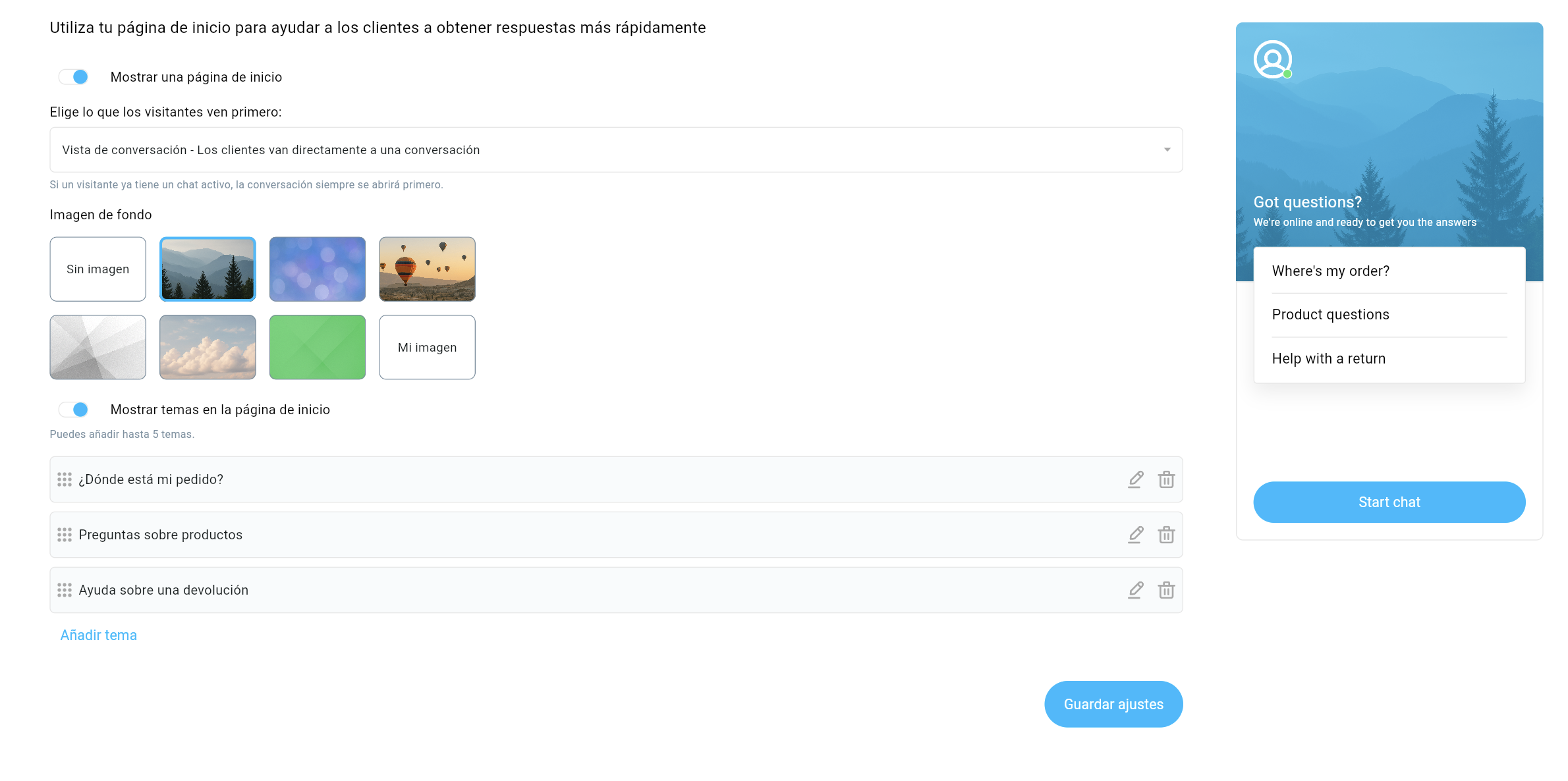 - Activa Mostrar temas en la página de inicio para mostrar temas sugeridos a los visitantes del chat. Puedes añadir hasta cinco temas. Al hacer clic en un tema, este se añade al chat como texto. Puedes cambiar su orden arrastrándolos, editar el texto o eliminarlos con el icono de la derecha.