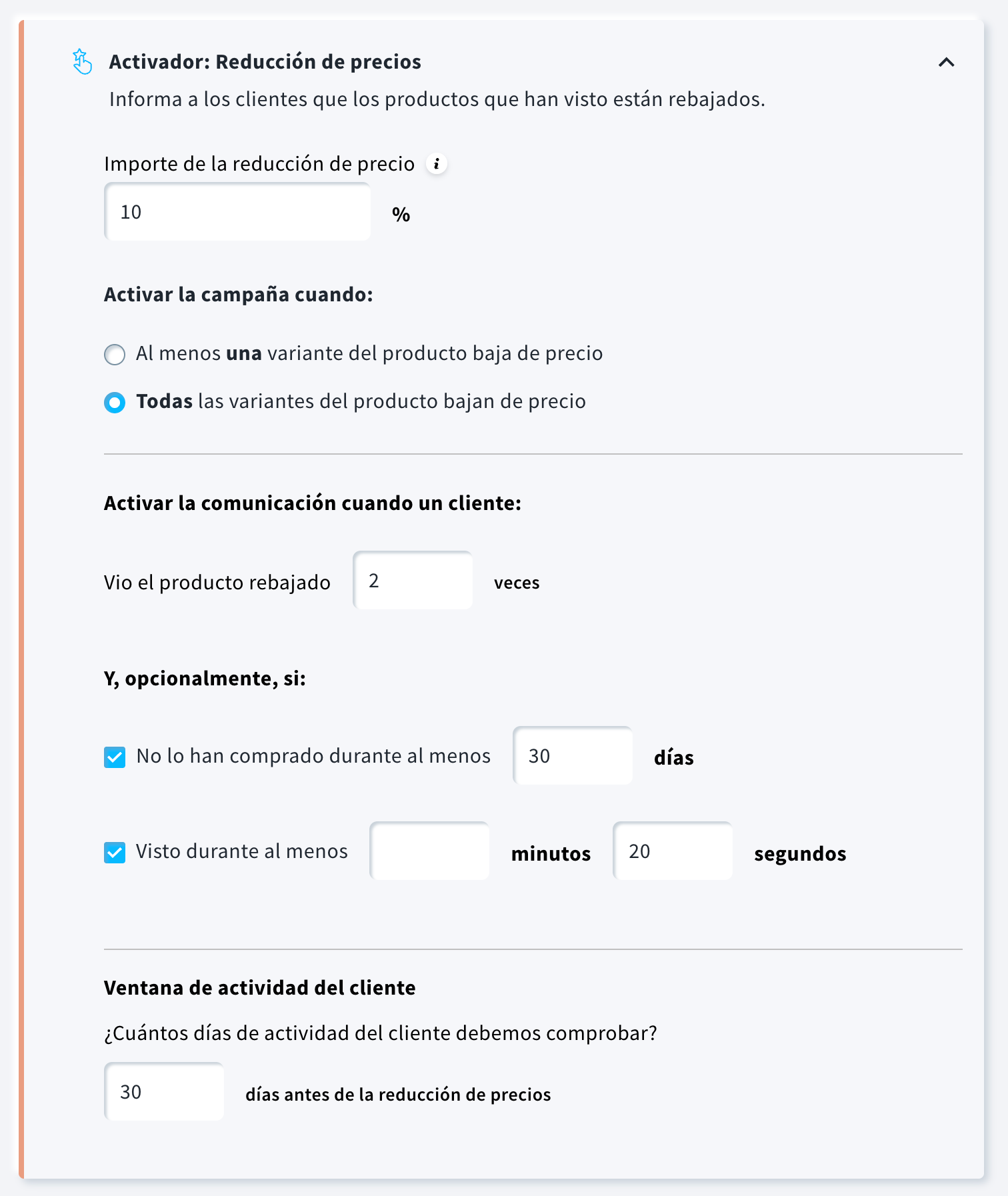 - En la sección Contenido, selecciona el activador de la campaña: Reducción de precios.