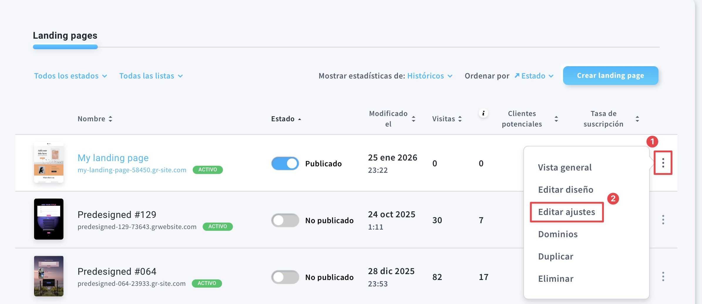 - Vaya a Herramientas > Landing pages.