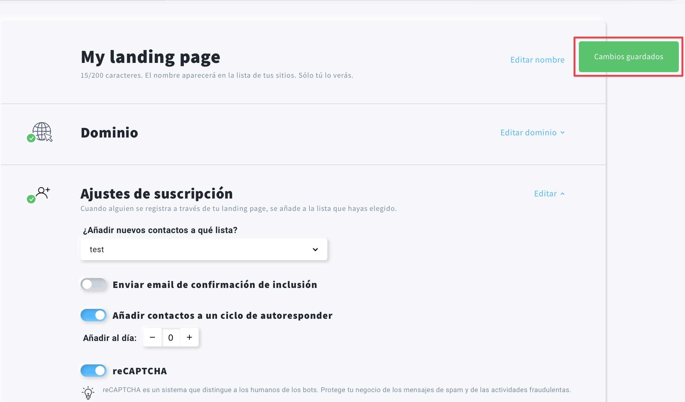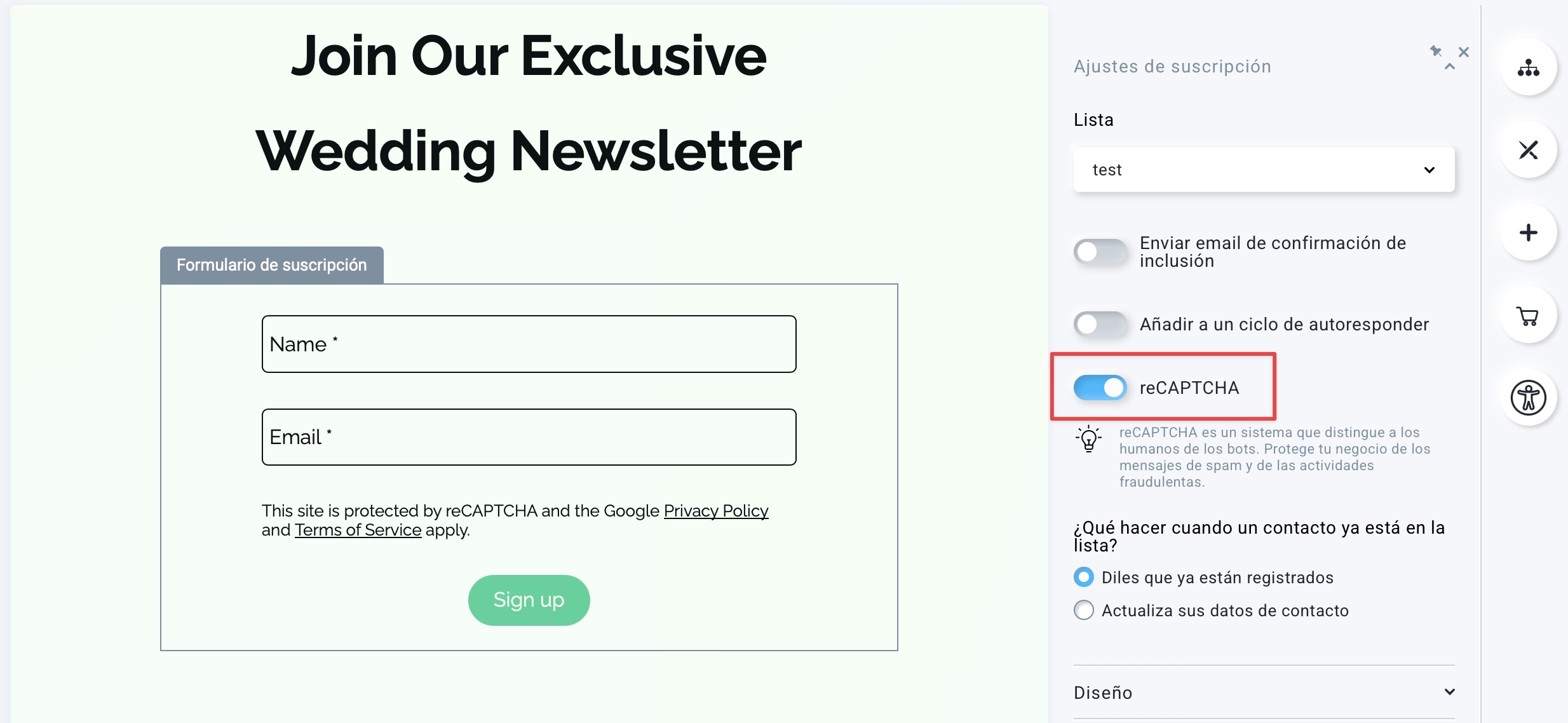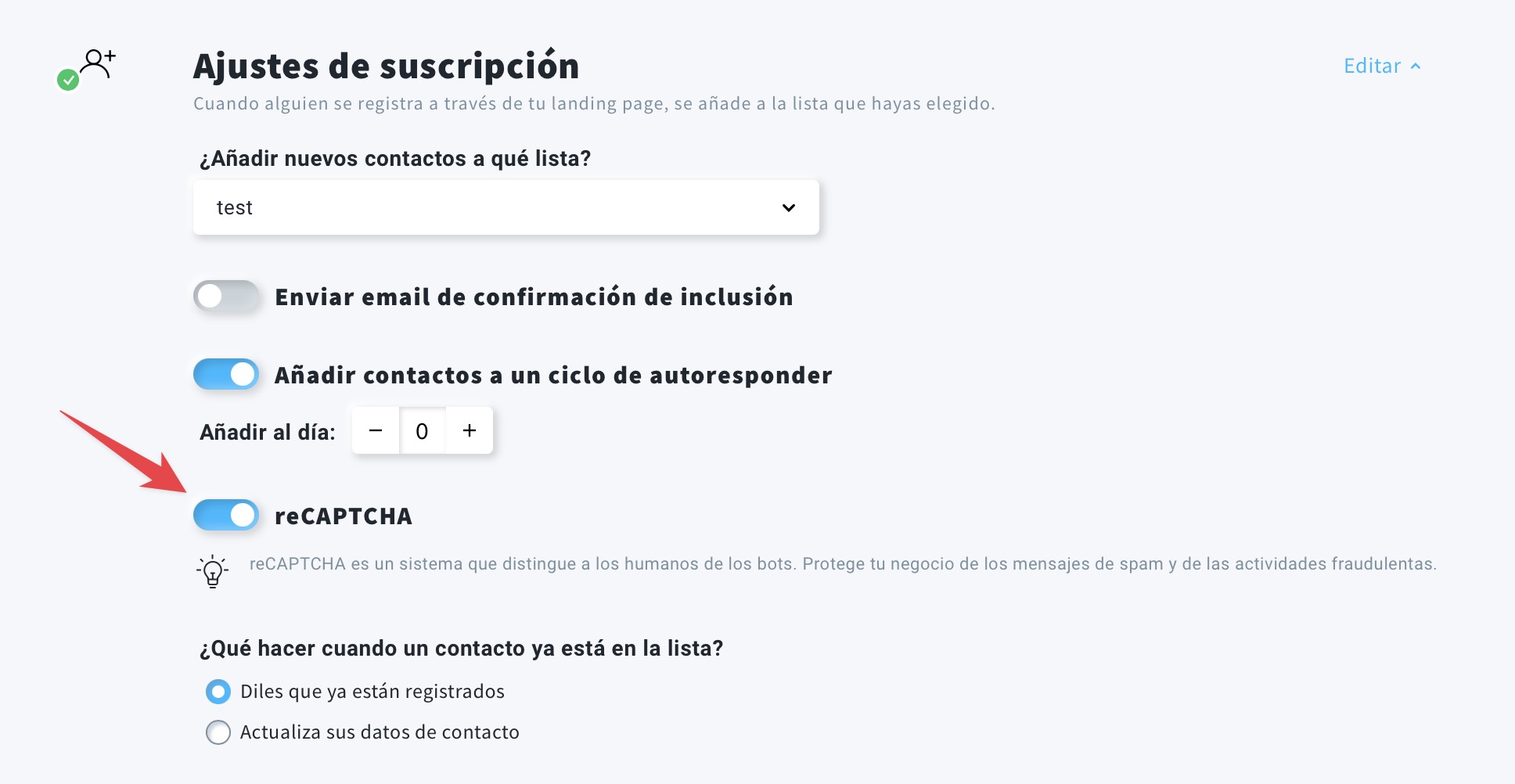 - Desplácese hacia abajo hasta la sección Ajustes de suscripción y active el interruptor de reCAPTCHA.