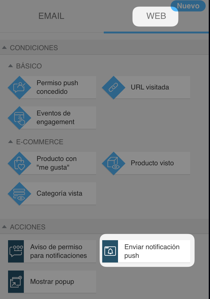 La acción Enviar notificación push está disponible tanto en el canal de Email como, ahora, en el canal Web. Sin embargo, hay varias diferencias clave entre ambos.