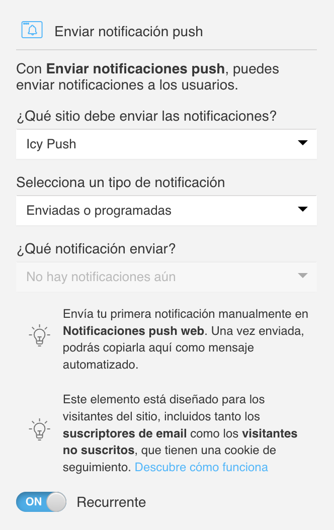 Además, a diferencia del elemento Enviar notificación push del canal Email, la versión web te permite llegar tanto a tus suscriptores de correo electrónico como a los visitantes de la web no suscritos que hayan aceptado recibir notificaciones push web.