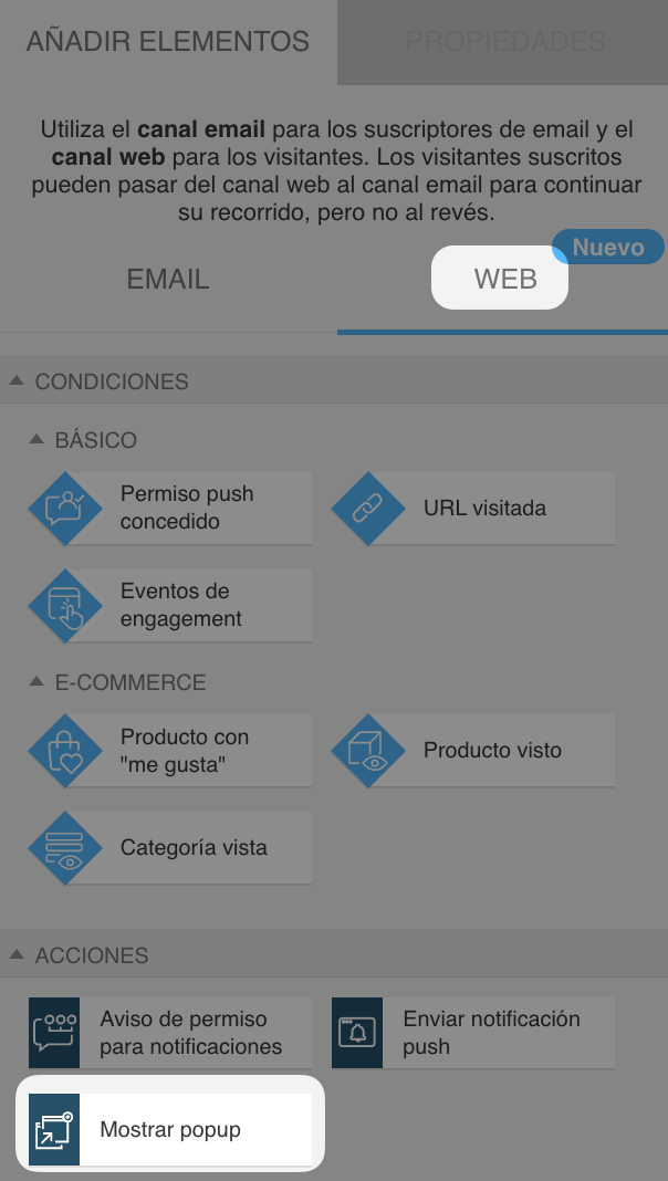 La automatización cuenta ahora con dos canales: Email y Web. El canal de Email se utiliza para llegar a tus suscriptores de correo electrónico, mientras que el canal Web te permite interactuar tanto con los suscriptores de Email como con los visitantes del sitio web que no están suscritos. Los usuarios suscritos pueden pasar del canal Web al de Email para continuar su recorrido, pero no al revés.