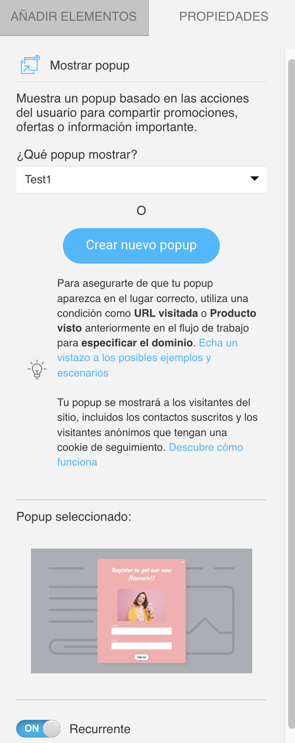 Una vez seleccionado, se mostrará una vista previa de la ventana emergente elegida. - También puedes habilitar Recurrente para esta acción, de modo que se active cada vez que se cumplan los criterios definidos.