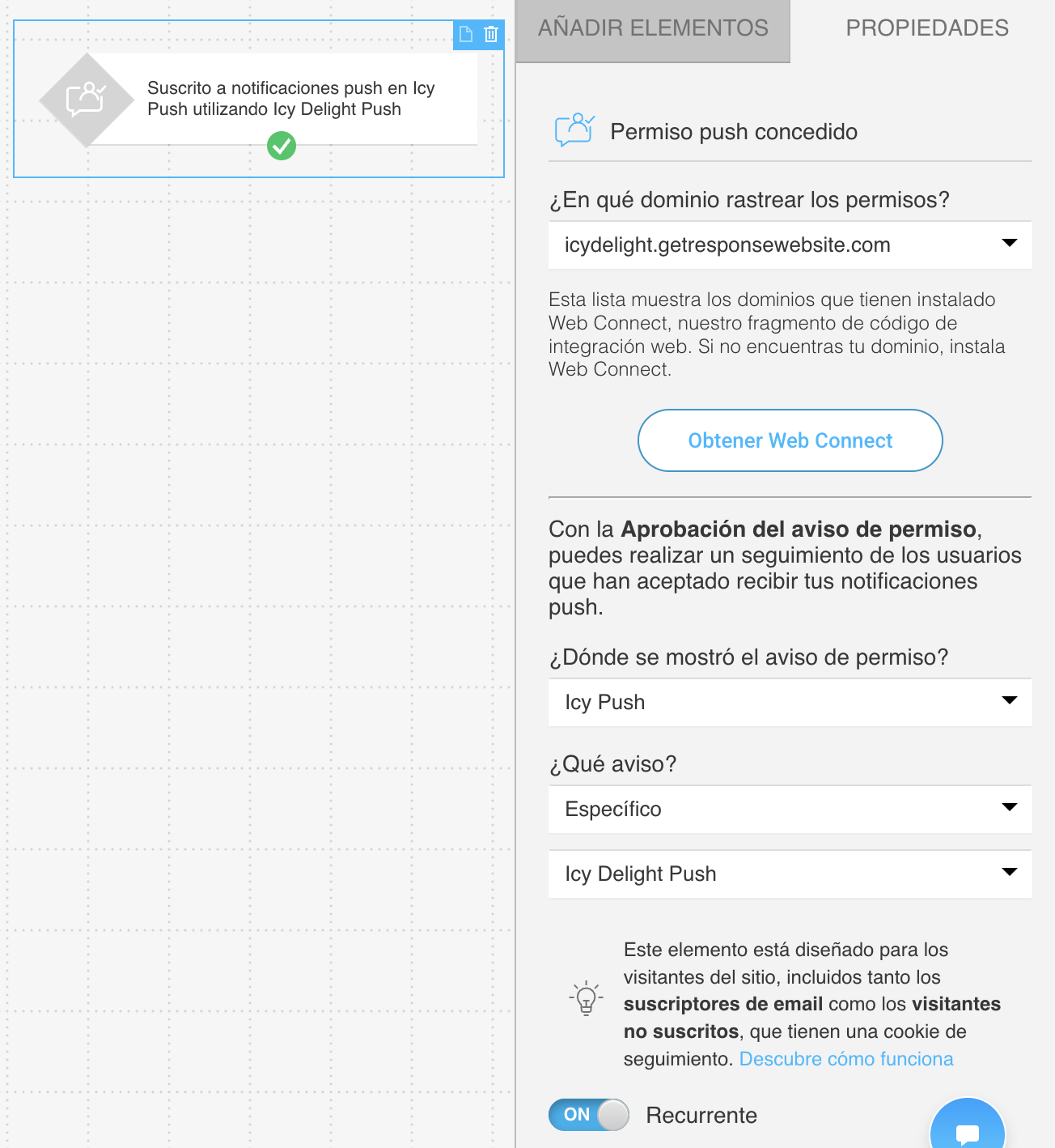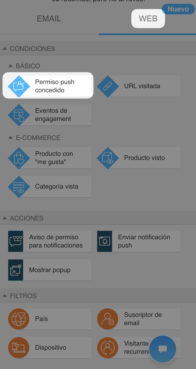 La condición Permiso push concedido solo está disponible en la versión web y funciona tanto para suscriptores de correo electrónico conocidos como para visitantes no suscritos.