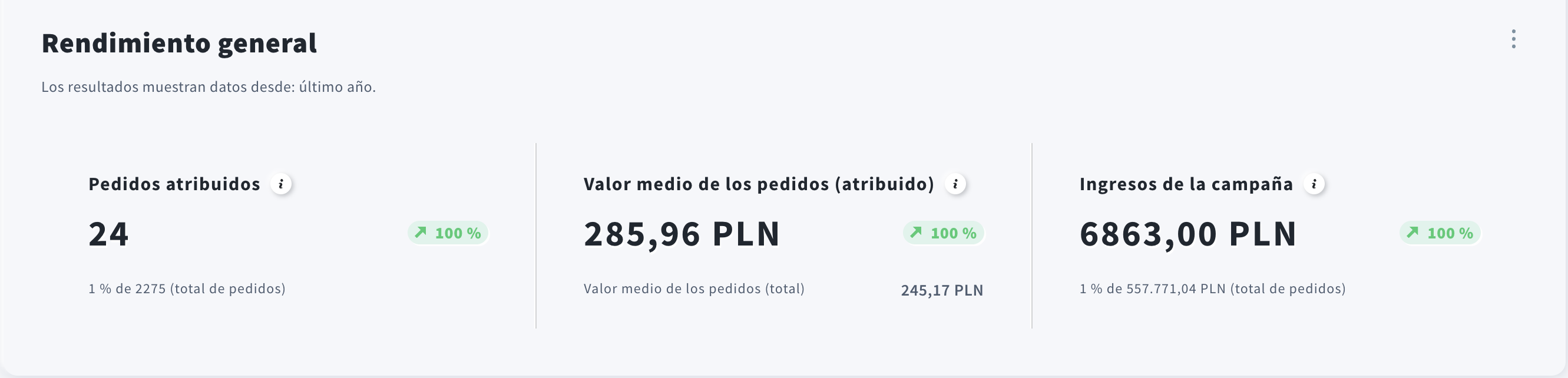 La tasa de conversión de pedidos muestra el porcentaje de pedidos pagados de la campaña de ecommerce seleccionada y del período indicado en comparación con todos los pedidos pagados.