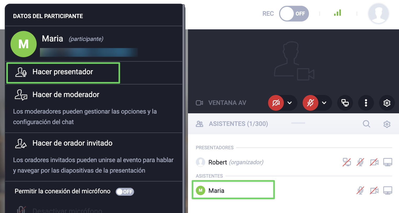 Para otorgar permisos de presentador, haz clic en el nombre del participante en la lista de Asistentes y selecciona Hacer presentador en la sección Datos del participante. Utiliza esta función para habilitar la transmisión de video y voz a los asistentes que puedan contribuir a tu presentación o a un miembro del equipo que pueda ayudar a moderar el chat. Además, todos los presentadores pueden utilizar la herramienta de presentación, la pizarra, la opción de compartir pantalla, el reproductor de YouTube y la función de encuestas.