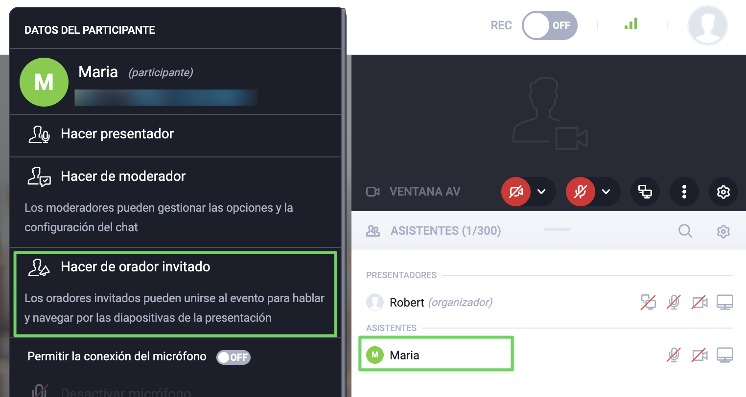 Durante cada webinar puede haber hasta tres presentadores, incluido usted. Además, puede otorgar privilegios de presentador a cualquier participante. Además, puedes designar un orador invitado con derechos ligeramente diferentes.